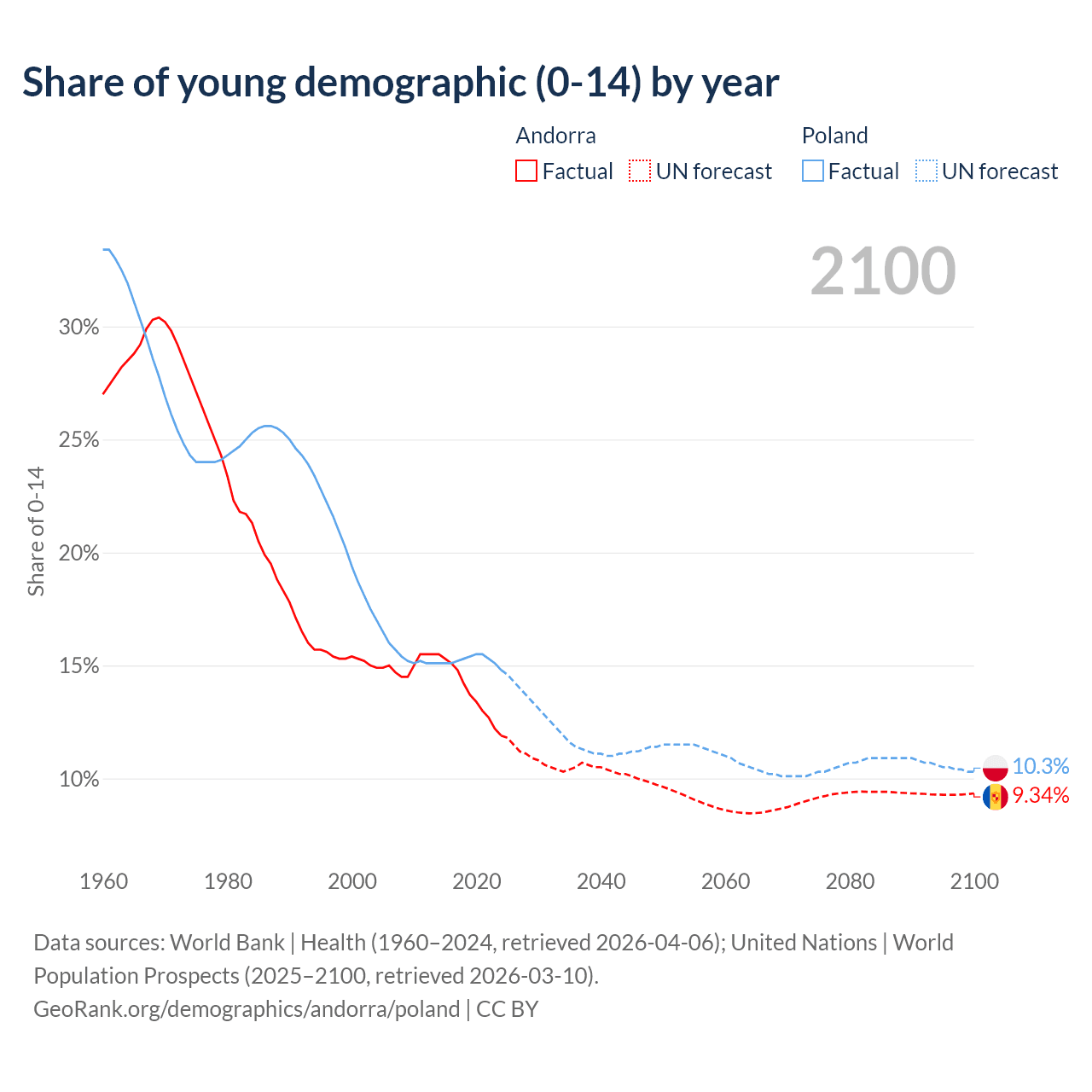 - The share of young demographic (0-15 years old) in Andorra is 11.9% vs 14.8% in Poland.