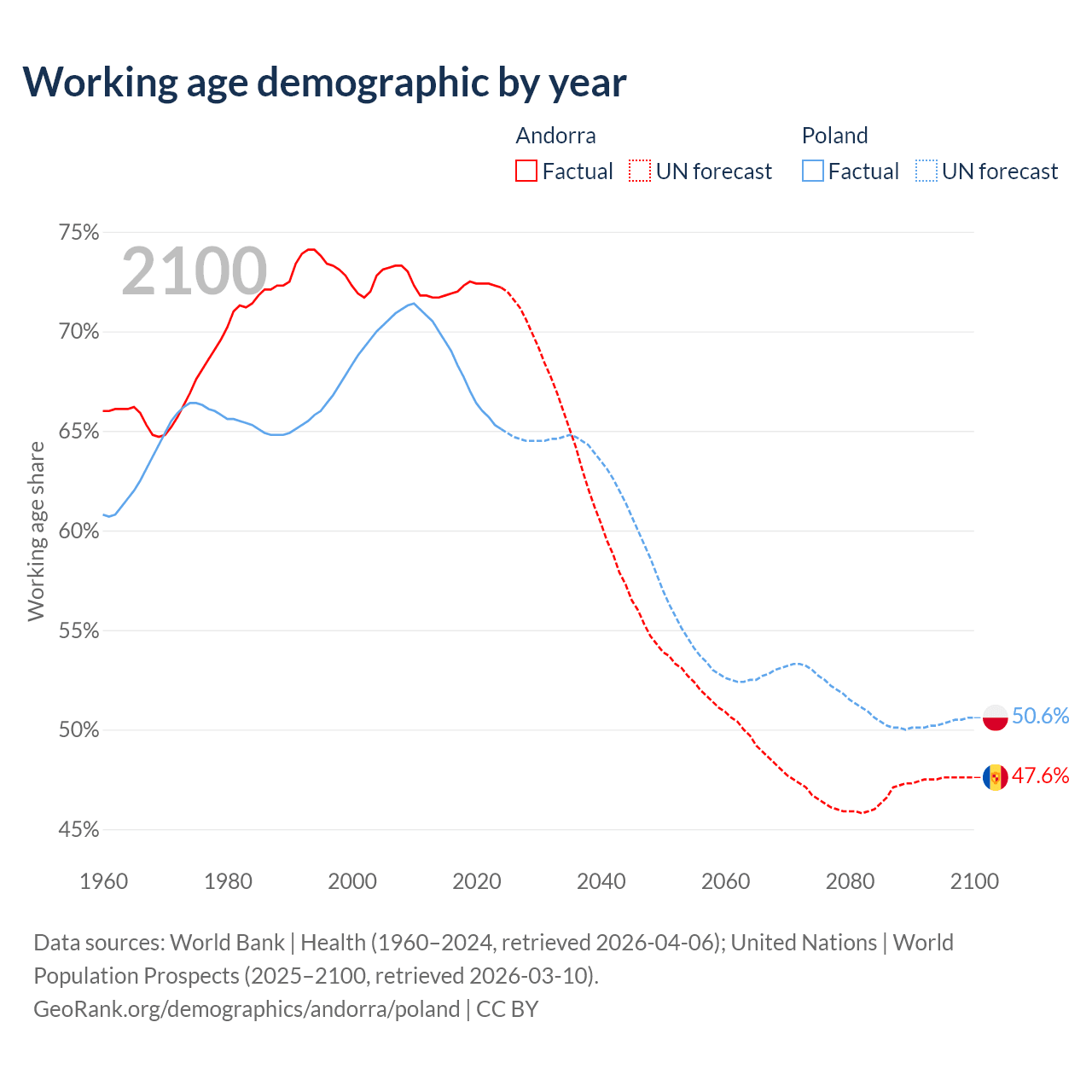 - Andorra has 60.7K working age adults (aged 15-64) vs 23.3M in Poland.