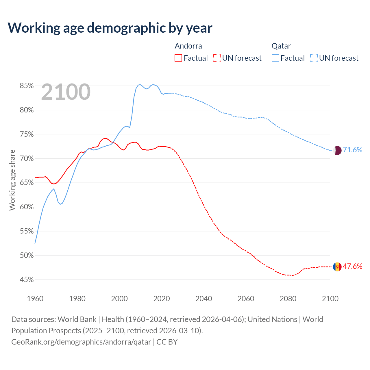 - Andorra has 60.7K working age adults (aged 15-64) vs 2.5M in Qatar.