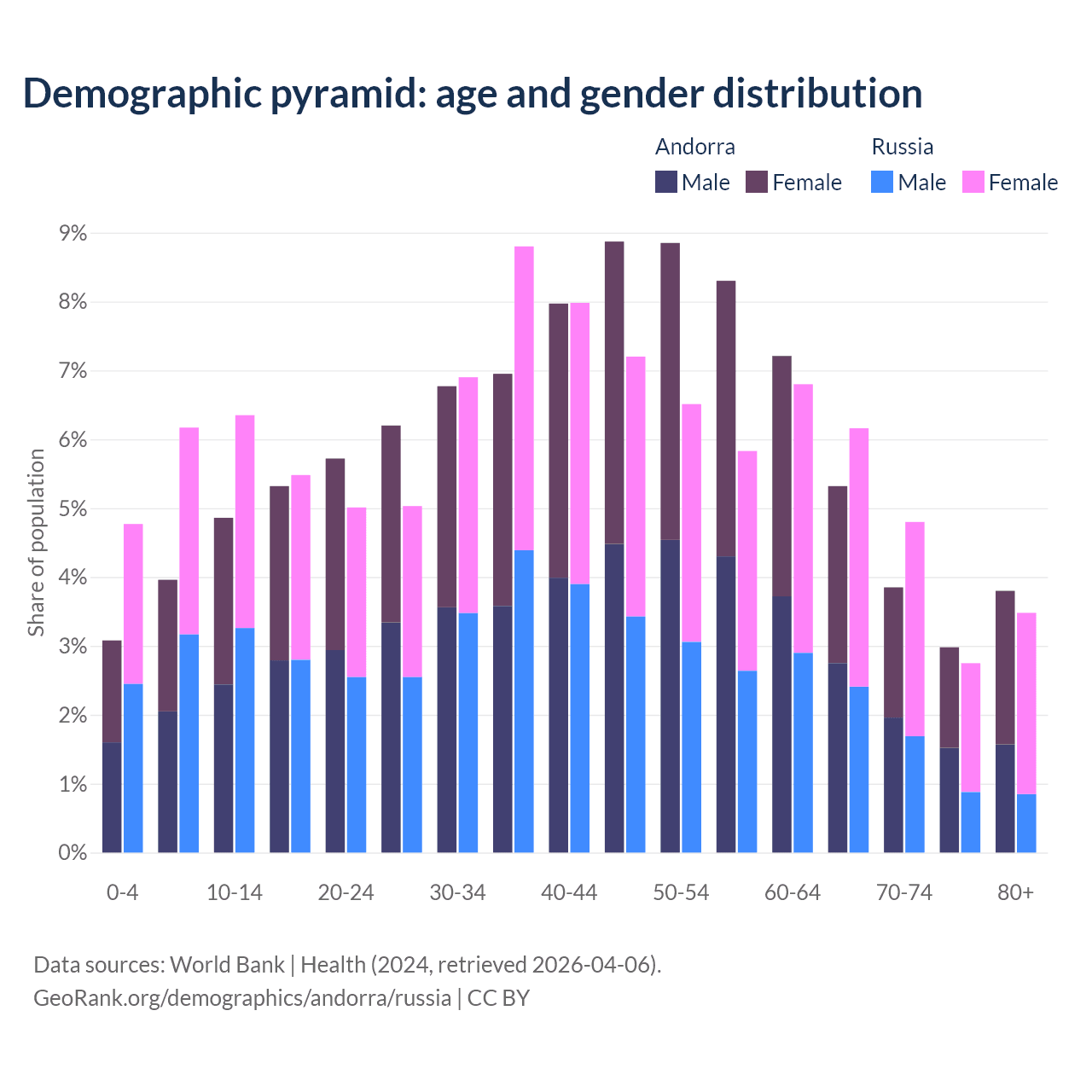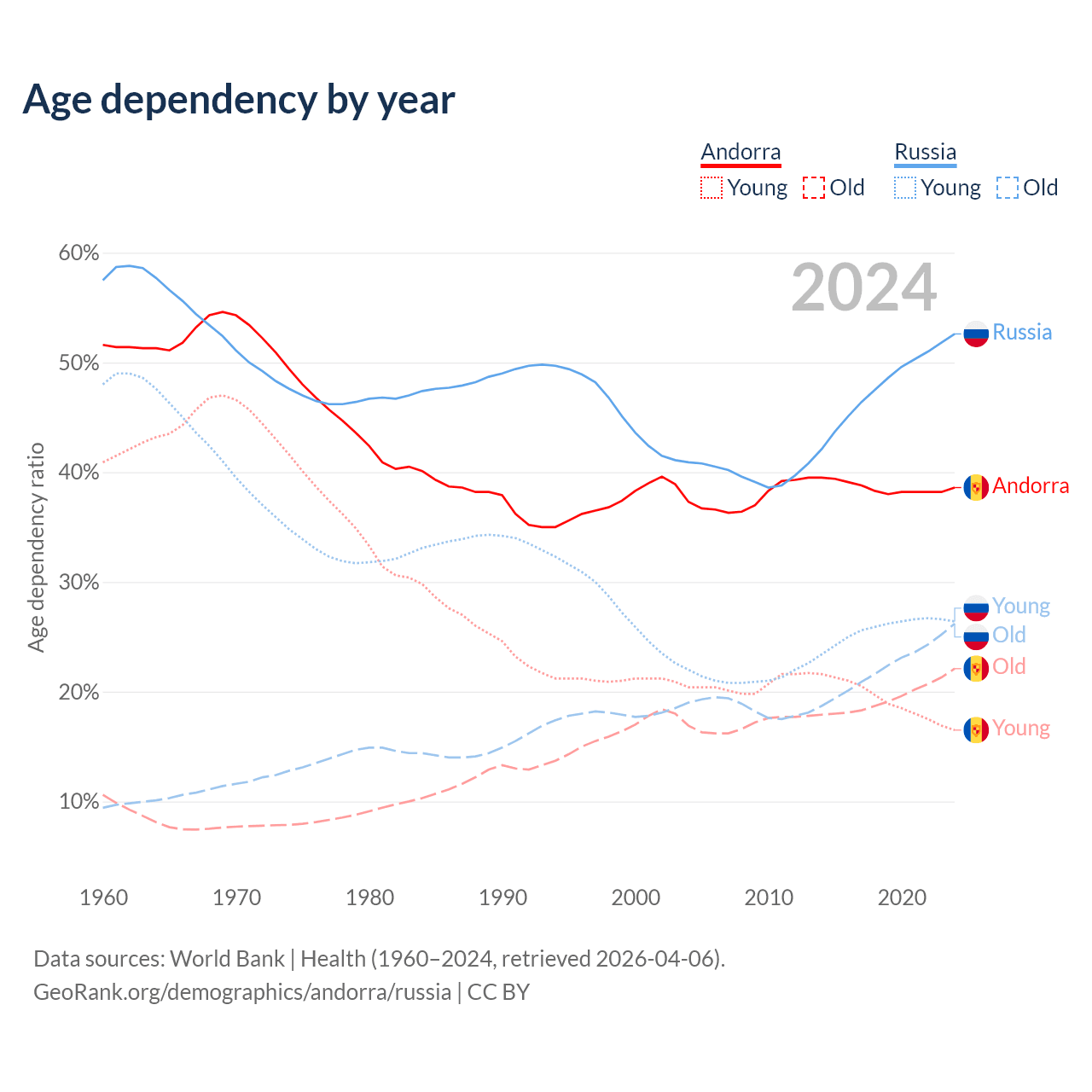 - Andorra is ranked 18/196 by median age (oldest to youngest) vs 42/196 for Russia.