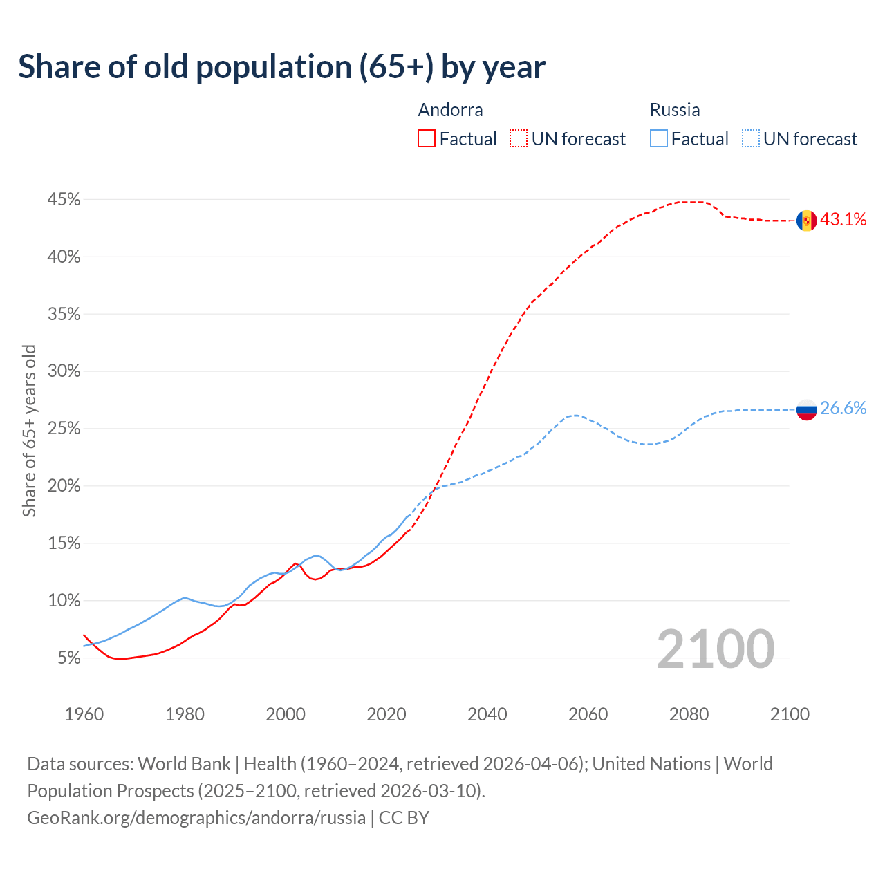 The share of older people aged 65 and over is 15.9% in Andorra and 17.2% in Russia. Life expectancy in Andorra compared to Russia .
