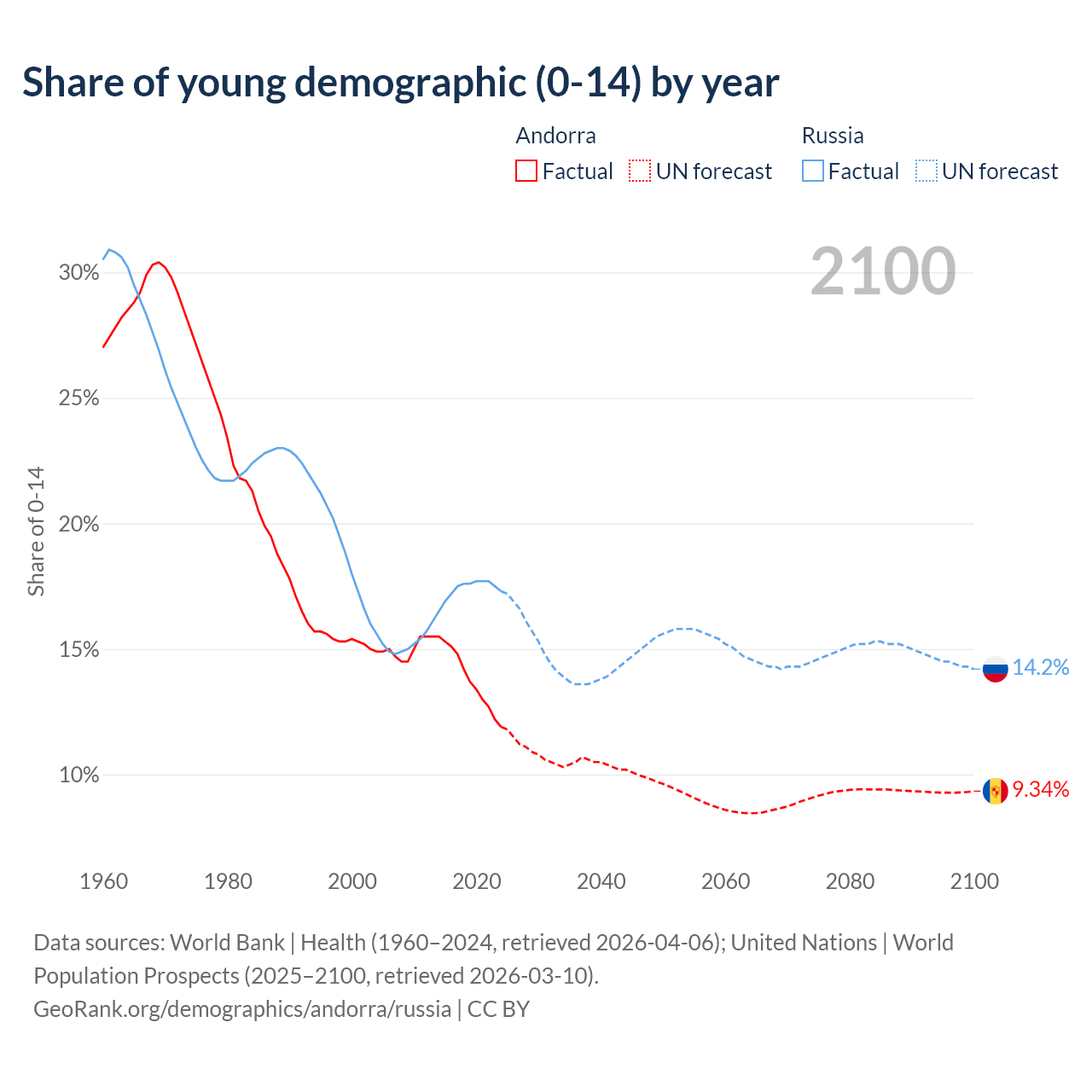 - The share of young demographic (0-15 years old) in Andorra is 11.9% vs 17.3% in Russia.