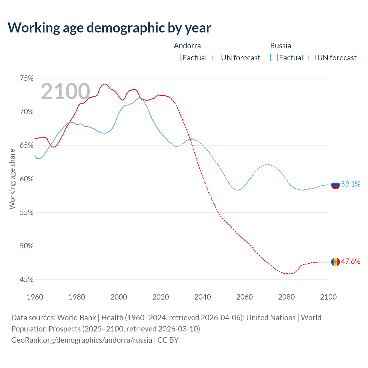 - Andorra has 60.7K working age adults (aged 15-64) vs 93M in Russia.