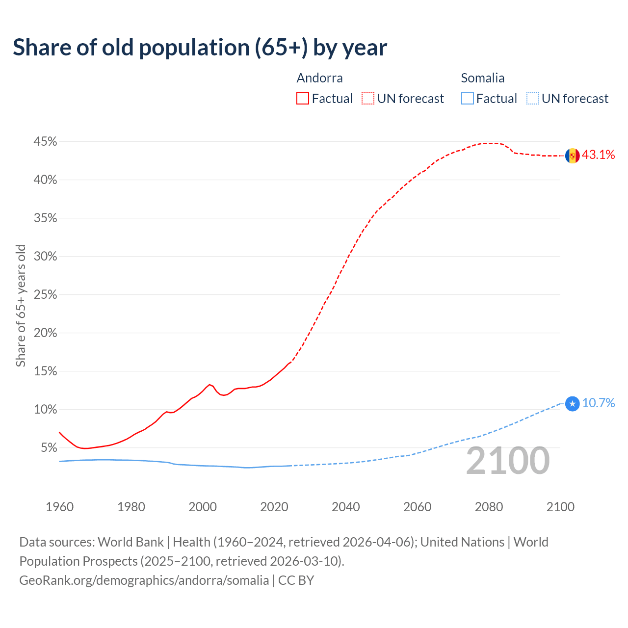 The share of older people aged 65 and over is 15.9% in Andorra and 2.59% in Somalia. Life expectancy in Andorra compared to Somalia .