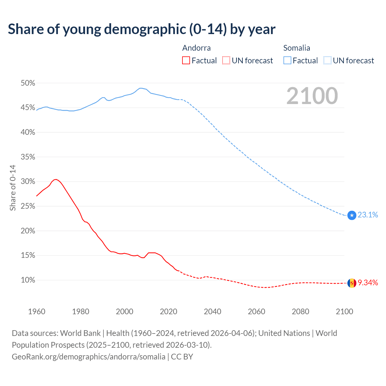 - The share of young demographic (0-15 years old) in Andorra is 11.9% vs 46.6% in Somalia.