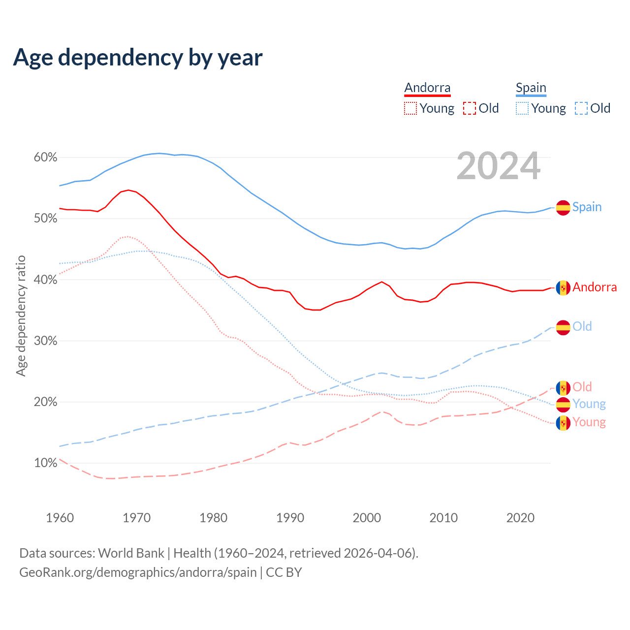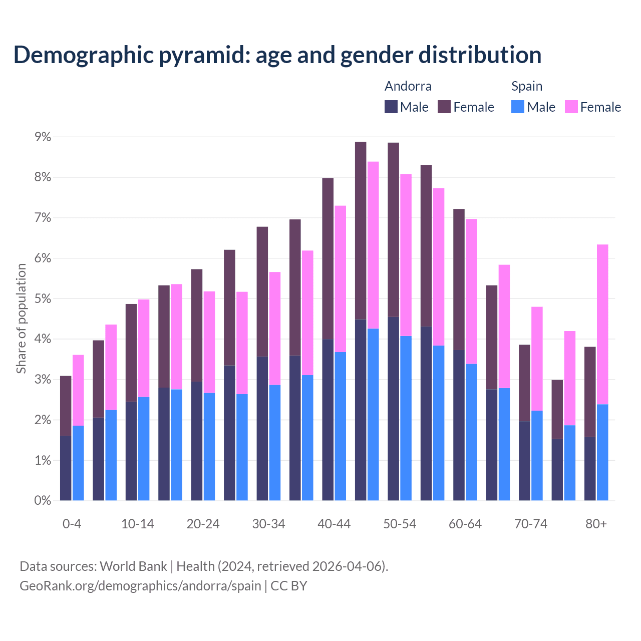 - Andorra is ranked 18/196 by median age (oldest to youngest) vs 7/196 for Spain.