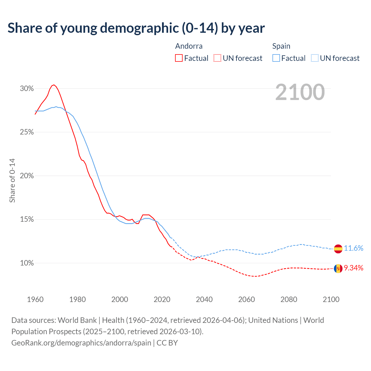 - The share of young demographic (0-15 years old) in Andorra is 11.9% vs 12.9% in Spain.