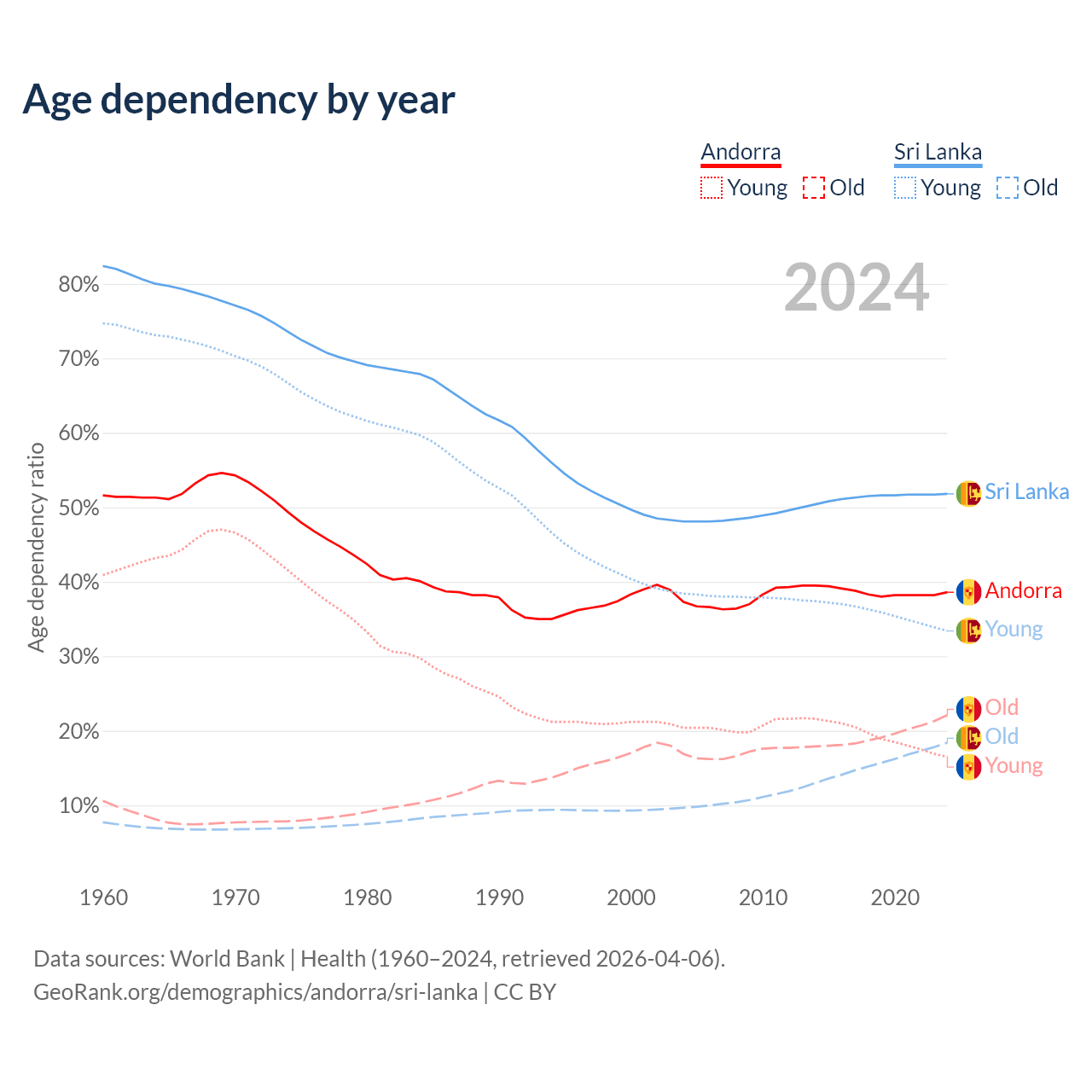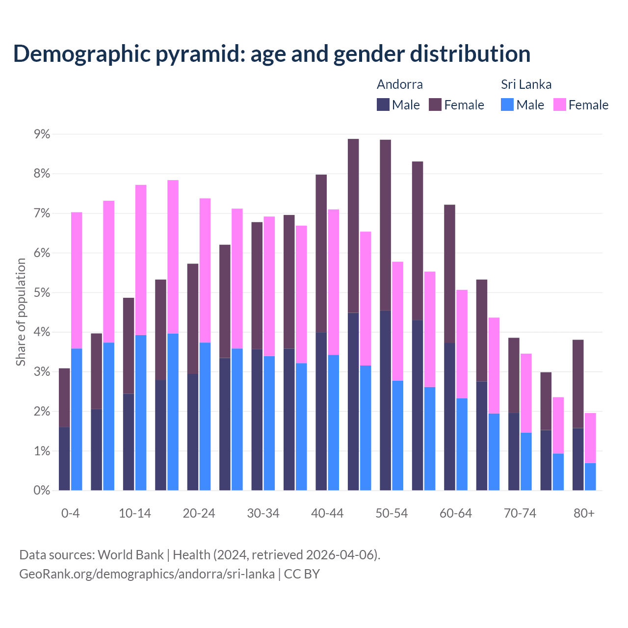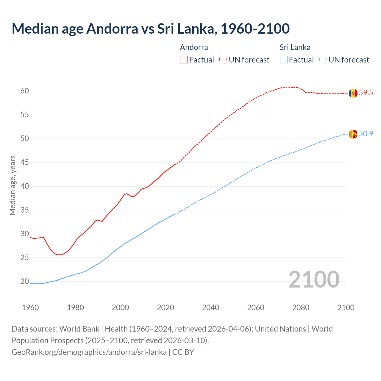 - Andorra is ranked 18/196 by median age (oldest to youngest) vs 81/196 for Sri Lanka.
