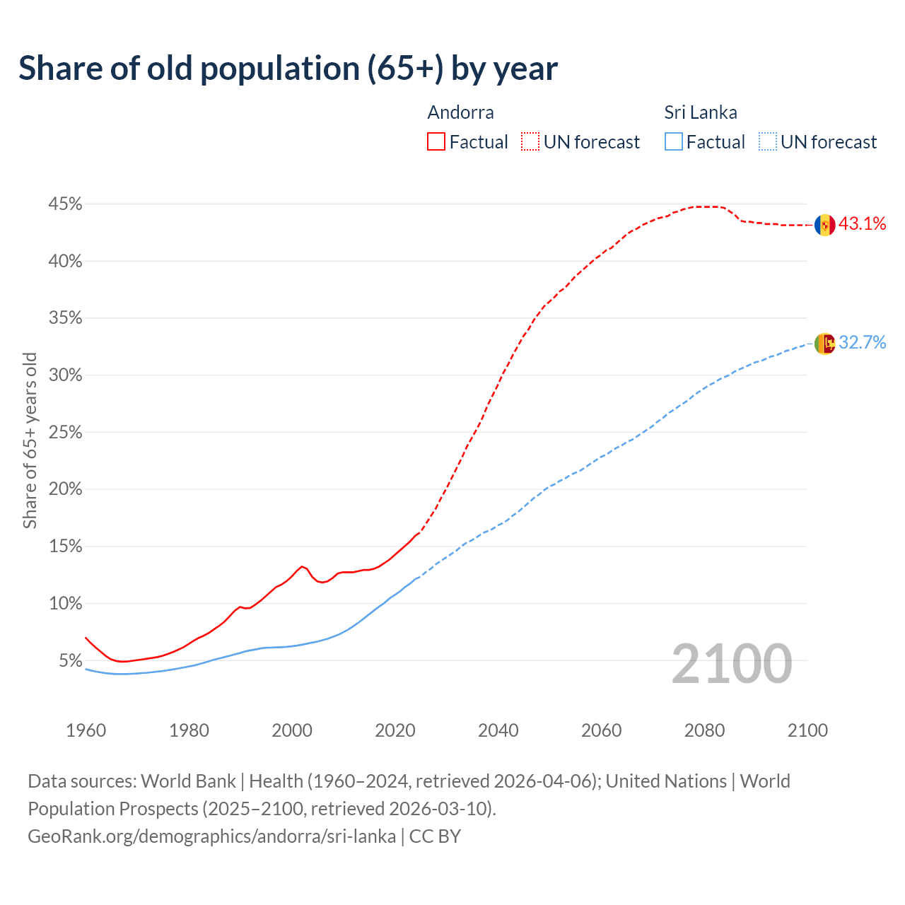 The share of older people aged 65 and over is 15.9% in Andorra and 12.1% in Sri Lanka. Life expectancy in Andorra compared to Sri Lanka .