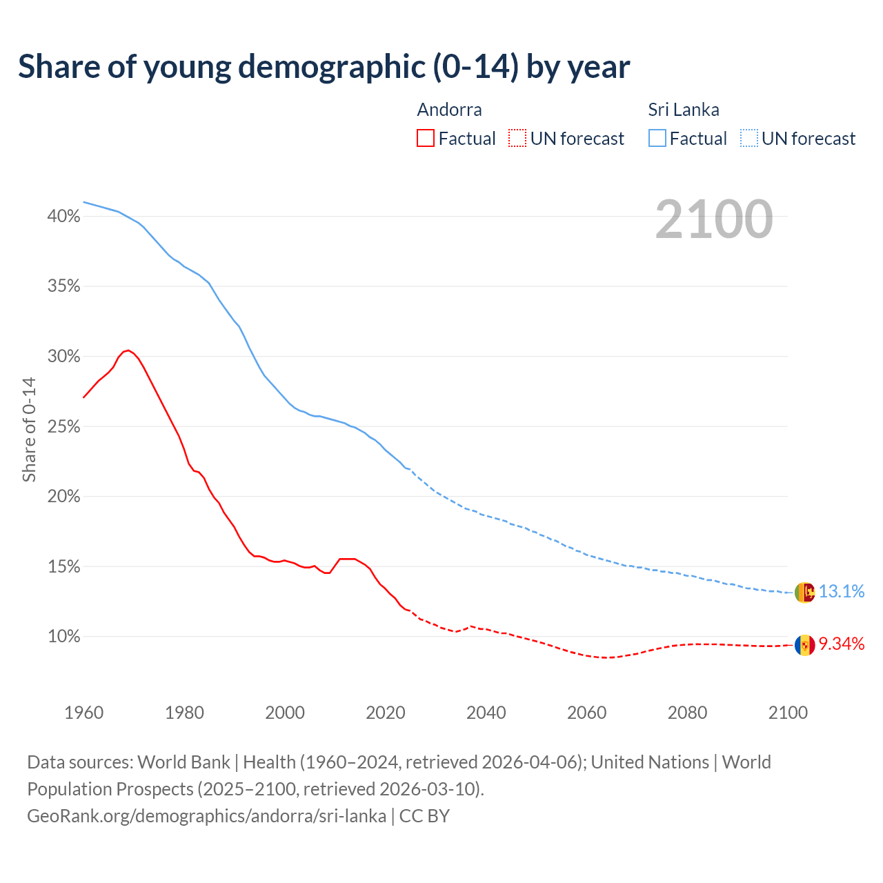 - The share of young demographic (0-15 years old) in Andorra is 11.9% vs 22% in Sri Lanka.