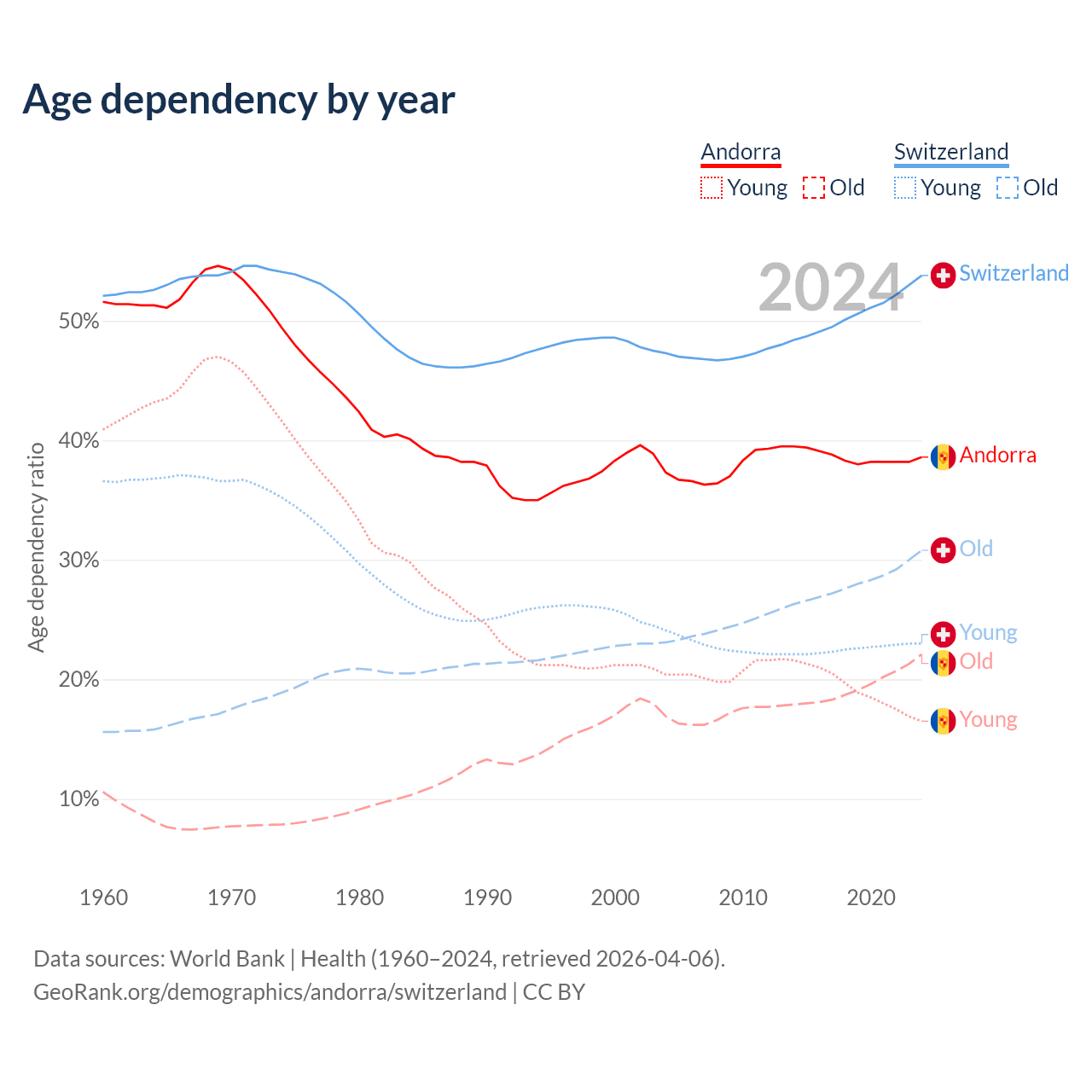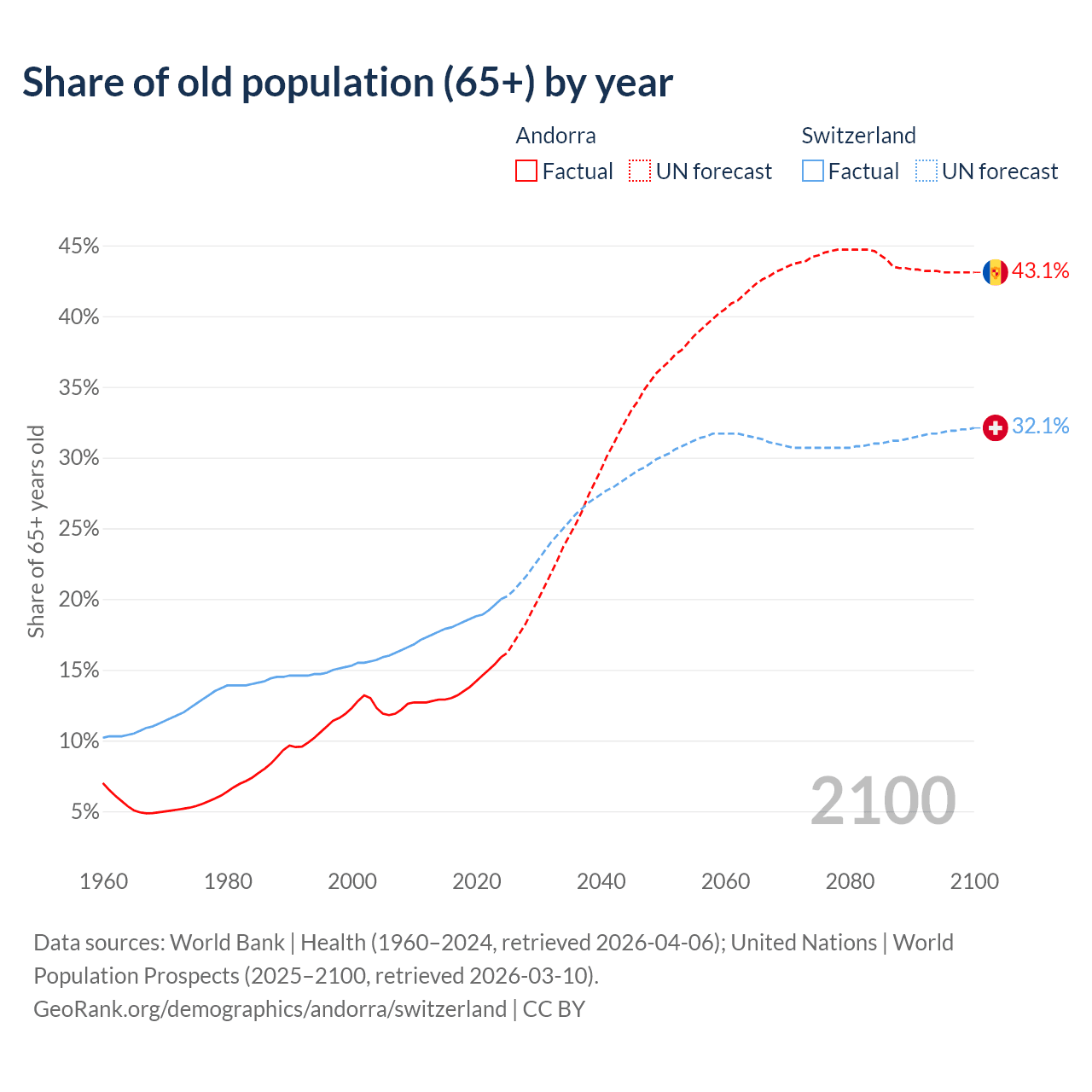 The share of older people aged 65 and over is 15.9% in Andorra and 20% in Switzerland. Life expectancy in Andorra compared to Switzerland .
