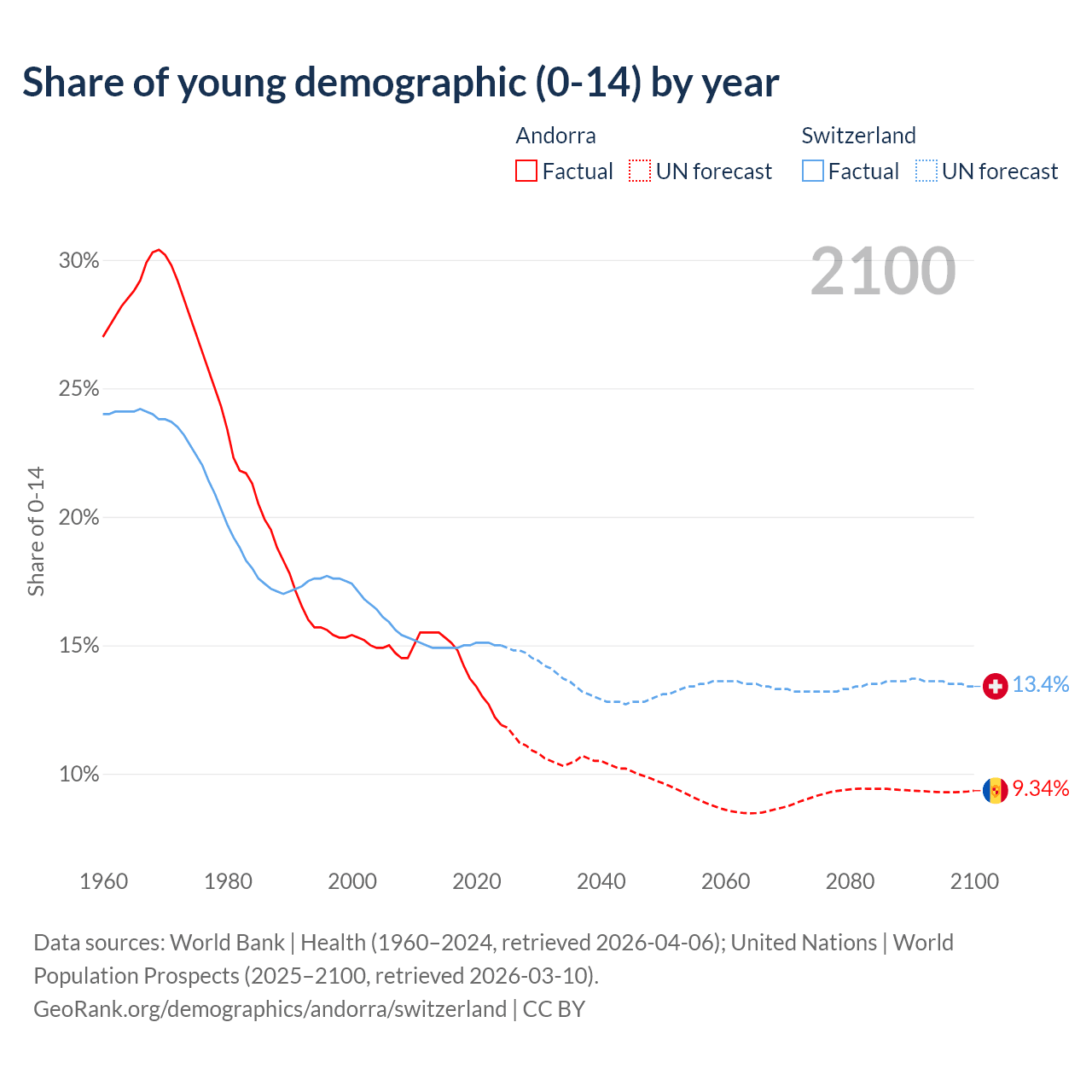 - The share of young demographic (0-15 years old) in Andorra is 11.9% vs 15% in Switzerland.