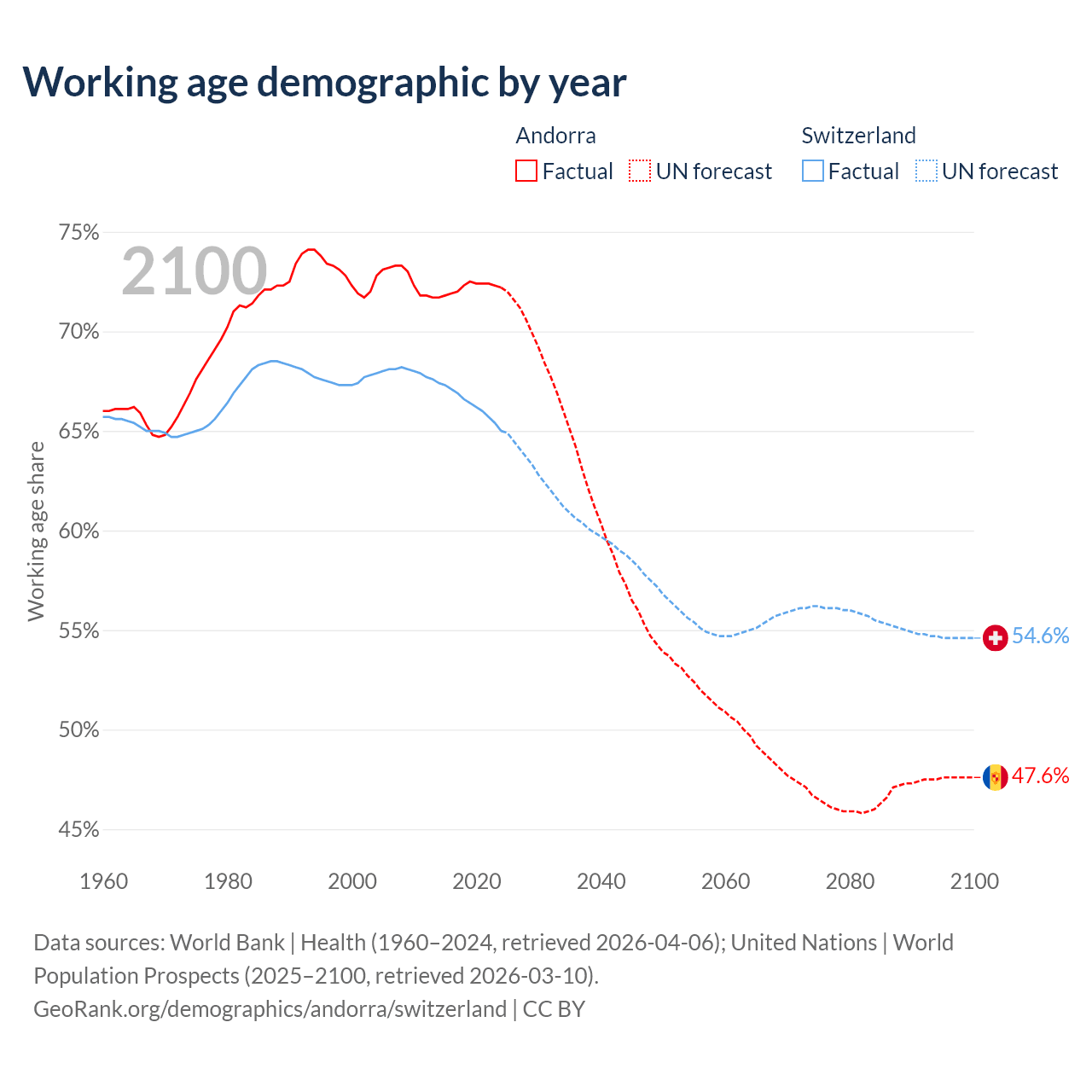 - Andorra has 60.7K working age adults (aged 15-64) vs 5.92M in Switzerland.