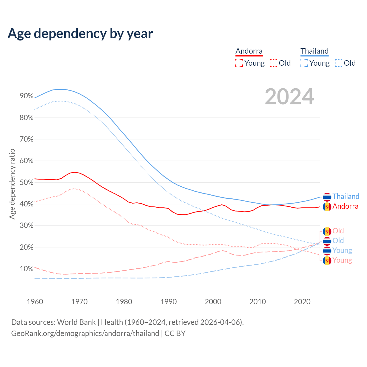- Andorra is ranked 18/196 by median age (oldest to youngest) vs 40/196 for Thailand.