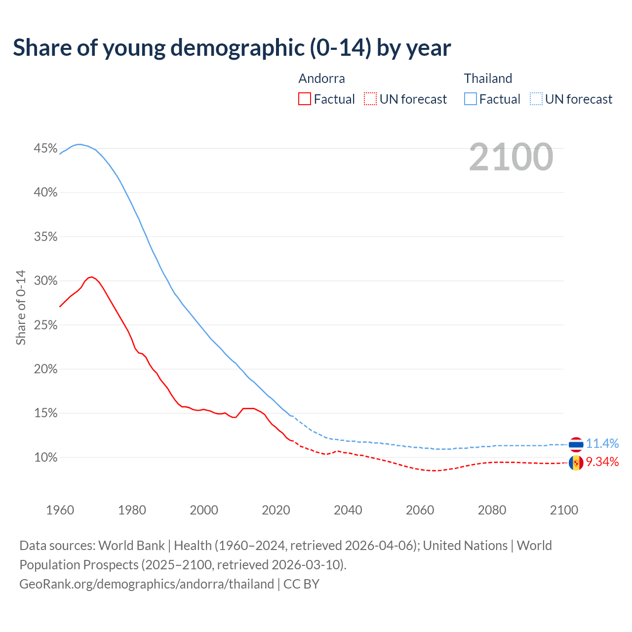 - The share of young demographic (0-15 years old) in Andorra is 11.9% vs 14.7% in Thailand.