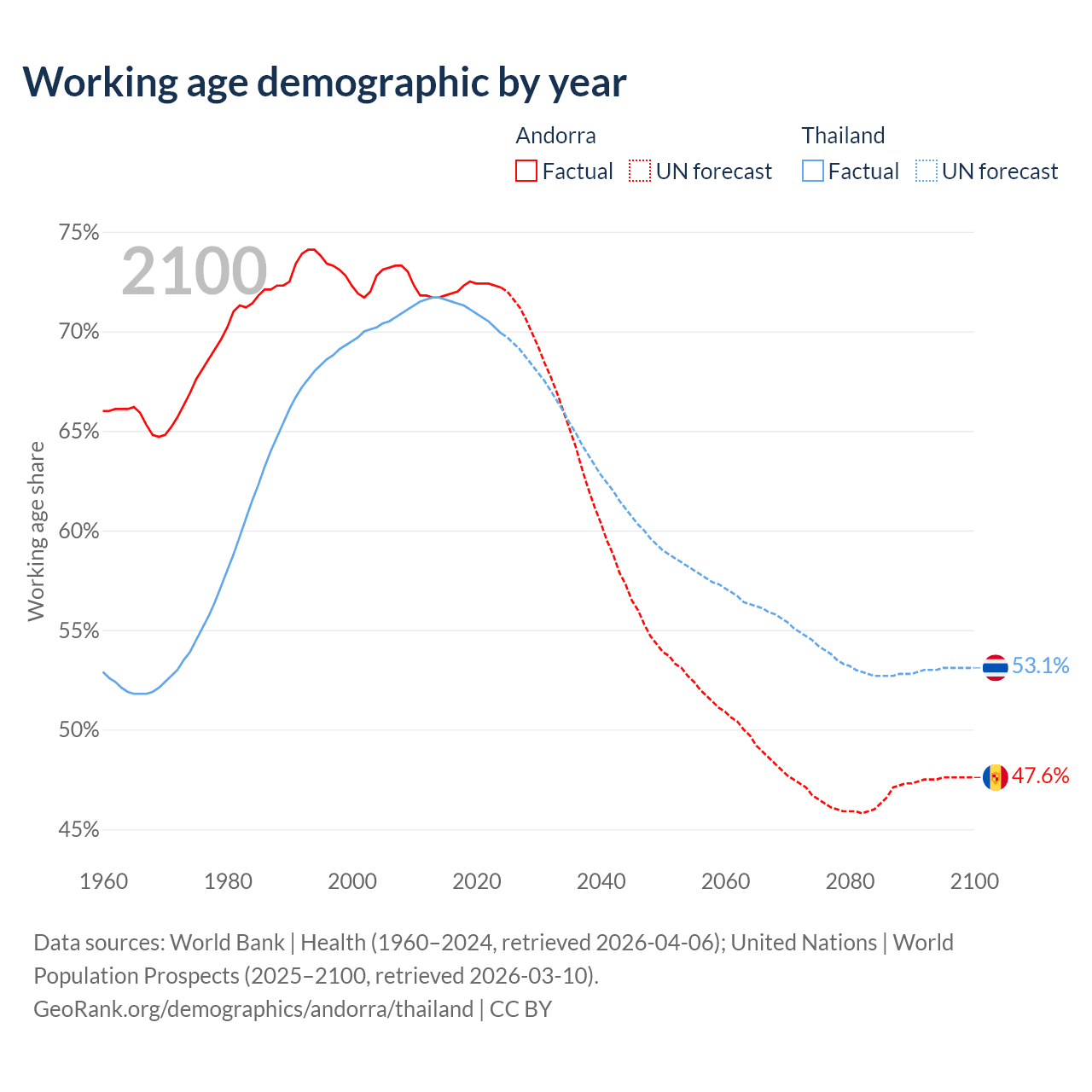 Median age Andorra vs Thailand, 1960-2100