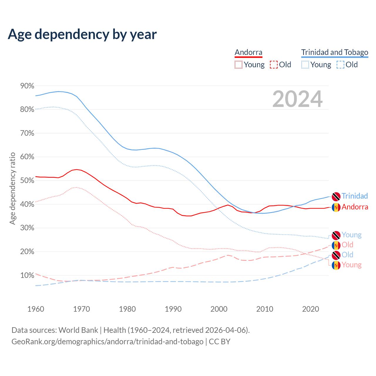 - Andorra is ranked 18/196 by median age (oldest to youngest) vs 58/196 for Trinidad and Tobago.