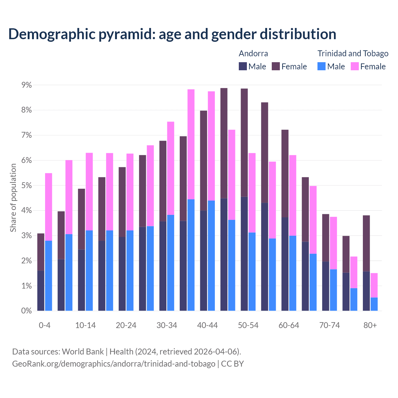 The share of older people aged 65 and over is 15.9% in Andorra and 12.4% in Trinidad and Tobago. Life expectancy in Andorra compared to Trinidad and Tobago .
