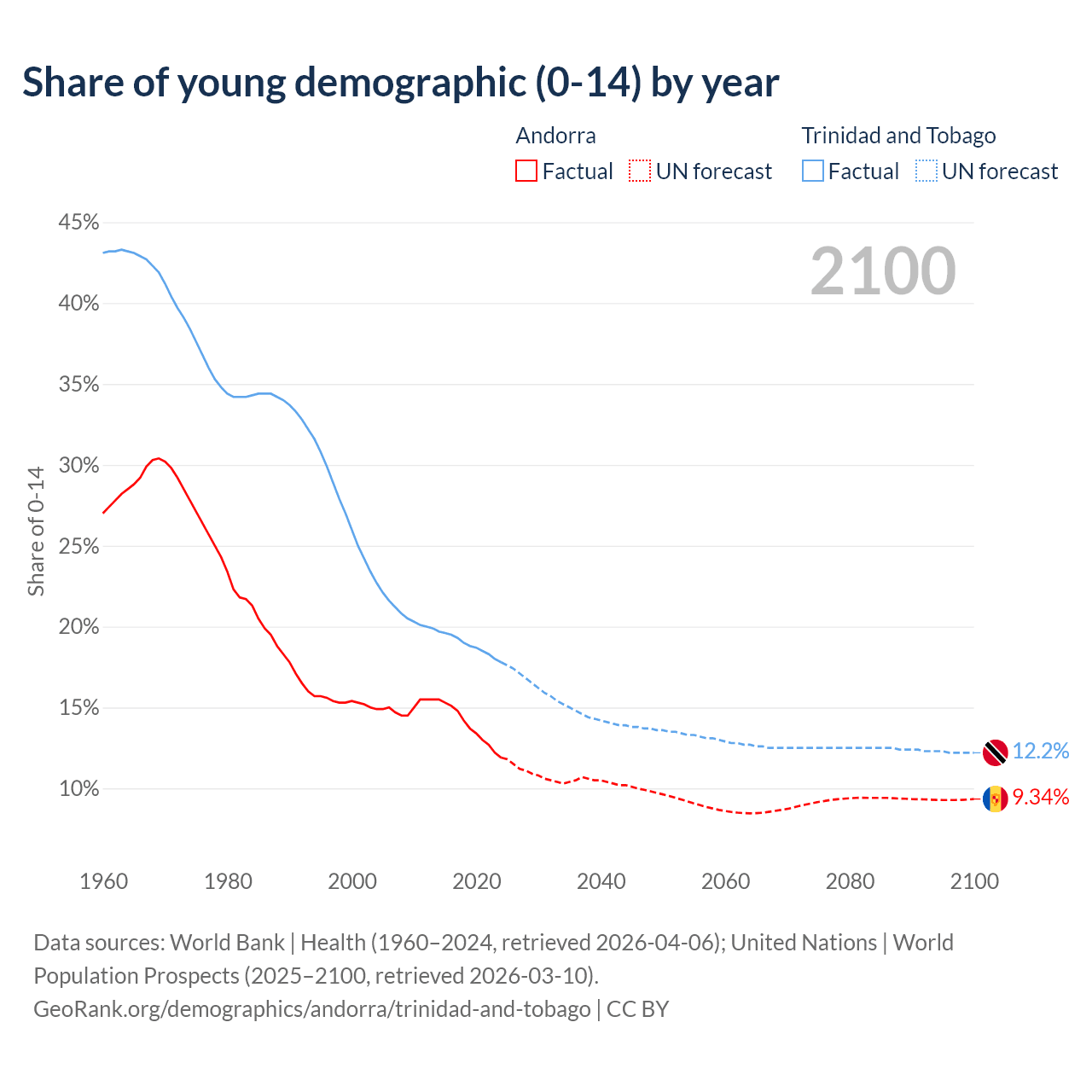 - The share of young demographic (0-15 years old) in Andorra is 11.9% vs 17.8% in Trinidad and Tobago.