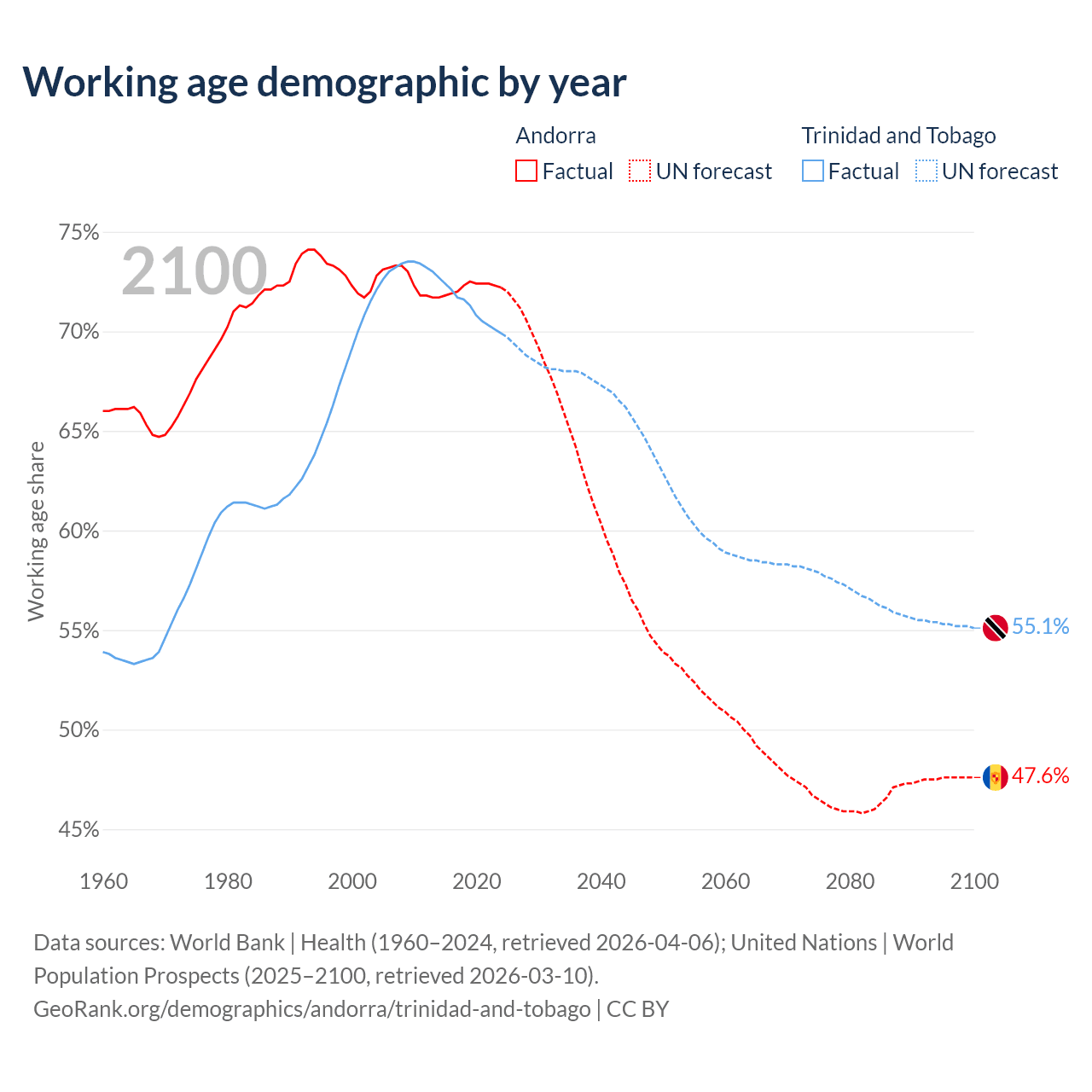 Median age Andorra vs Trinidad and Tobago, 1960-2100