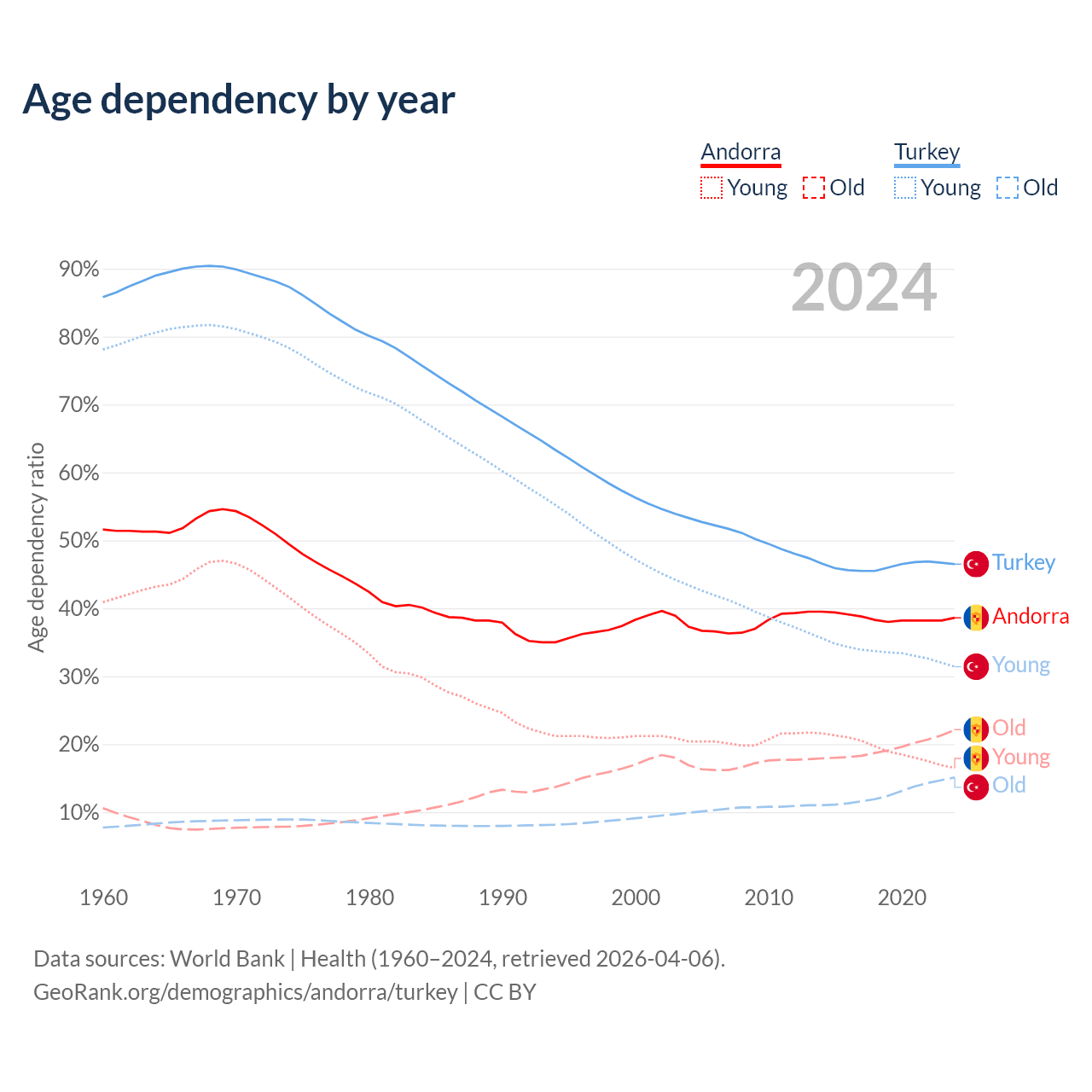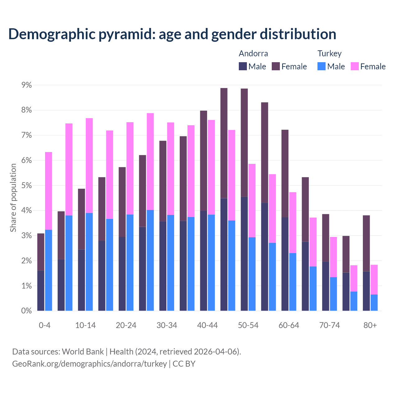 - Andorra is ranked 18/196 by median age (oldest to youngest) vs 83/196 for Turkey.