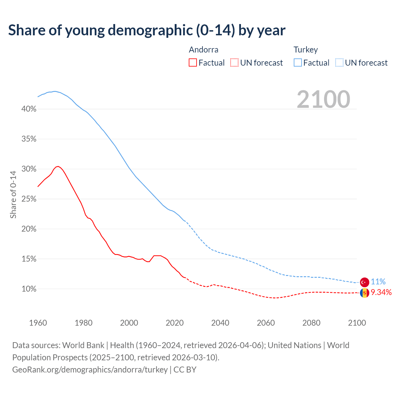 - The share of young demographic (0-15 years old) in Andorra is 11.9% vs 21.4% in Turkey.