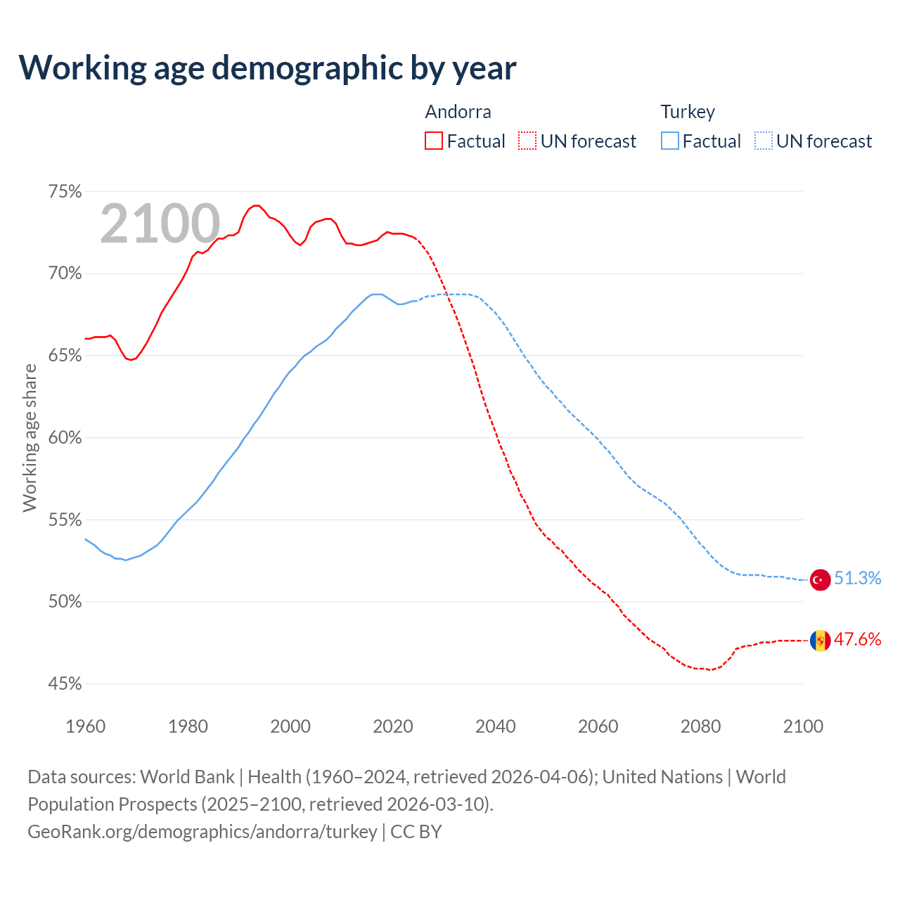 - Andorra has 60.7K working age adults (aged 15-64) vs 58.7M in Turkey.