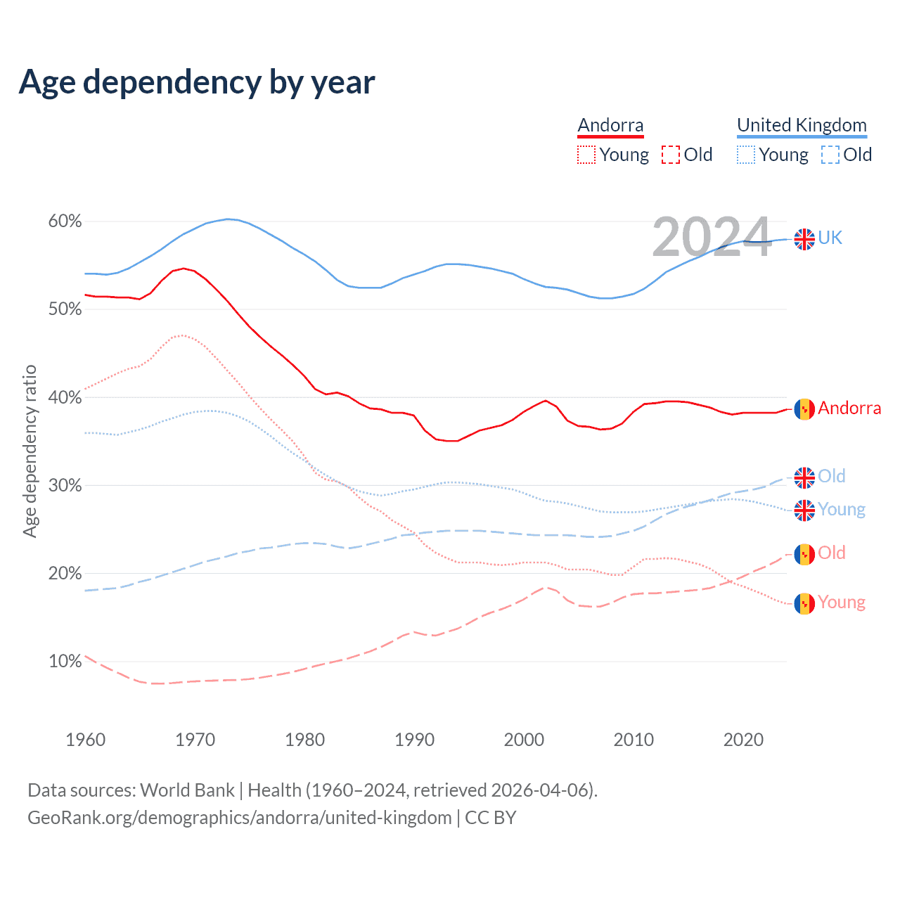 - Andorra is ranked 18/196 by median age (oldest to youngest) vs 41/196 for the United Kingdom.