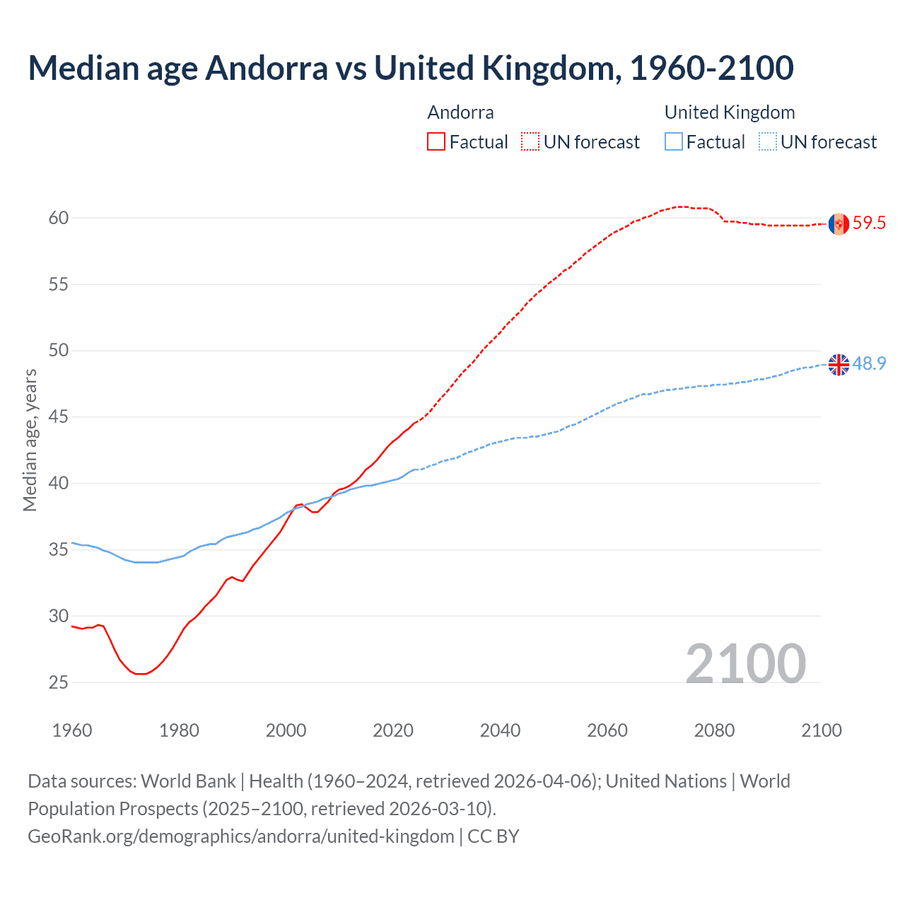 Median age Andorra vs United Kingdom, 1960-2100