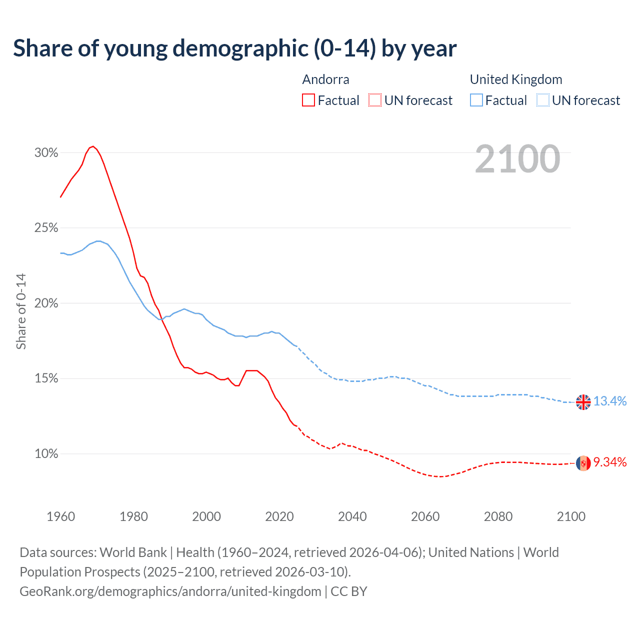 - The share of young demographic (0-15 years old) in Andorra is 11.9% vs 17.2% in the United Kingdom.