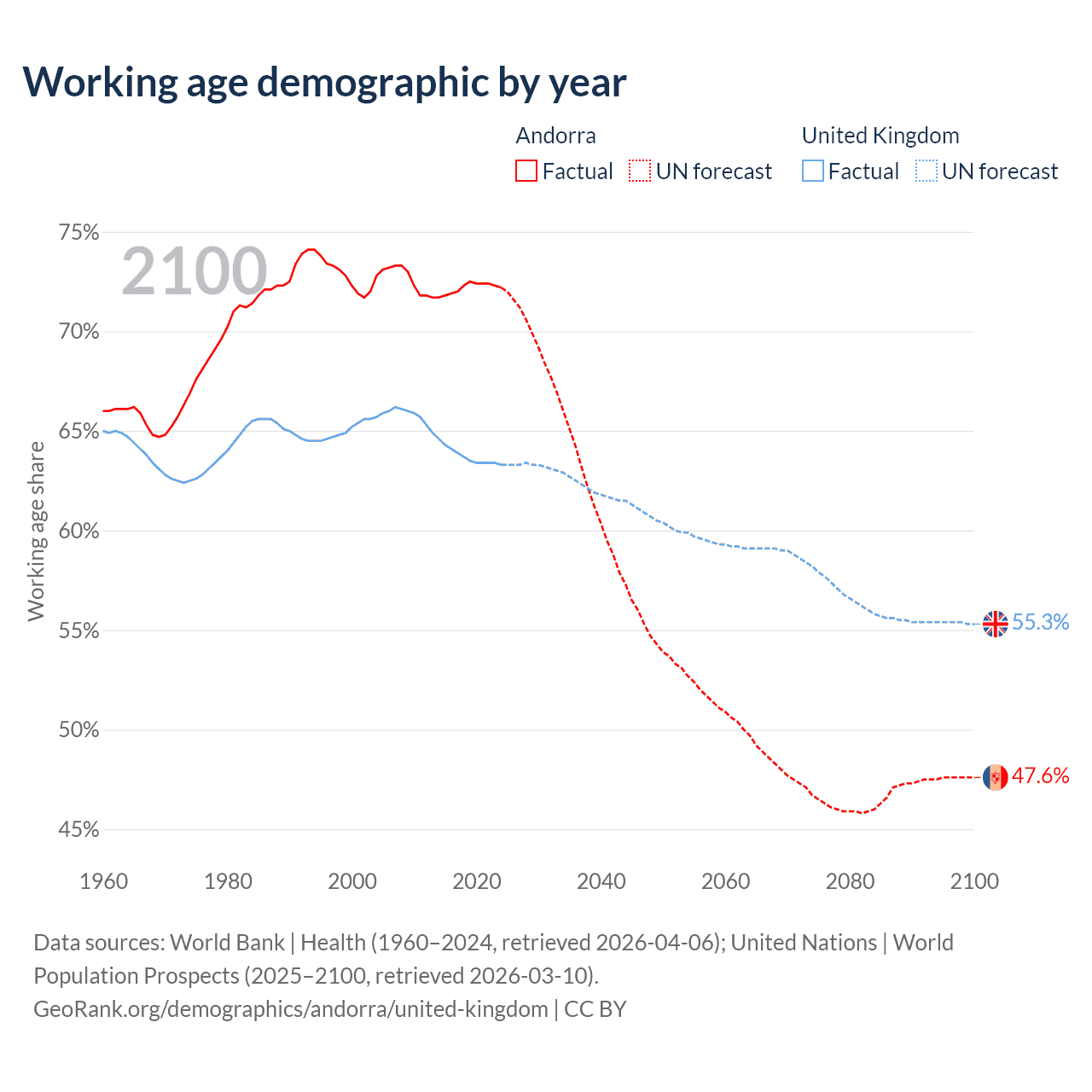 - Andorra has 60.7K working age adults (aged 15-64) vs 44.4M in the United Kingdom.