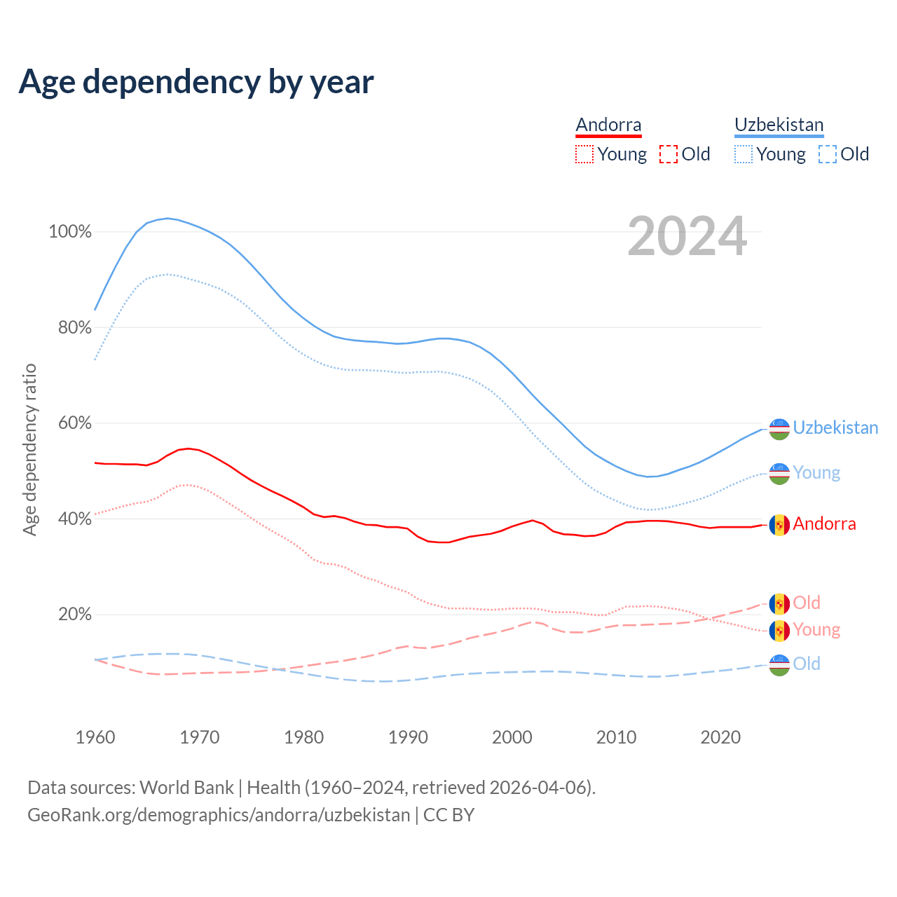 - The share of old-age demographic (65+) in Andorra is 15.9% vs 5.86% in Uzbekistan.