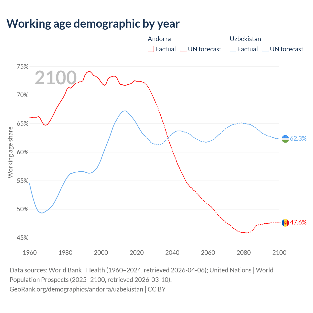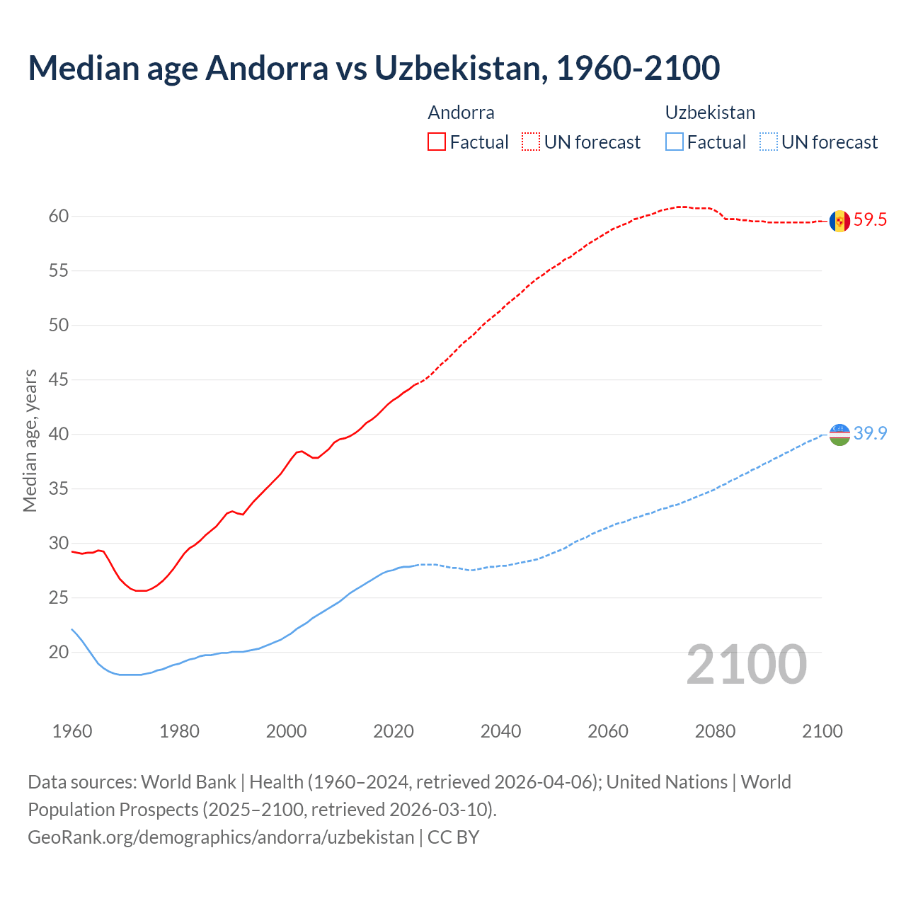 Median age Andorra vs Uzbekistan, 1960-2100