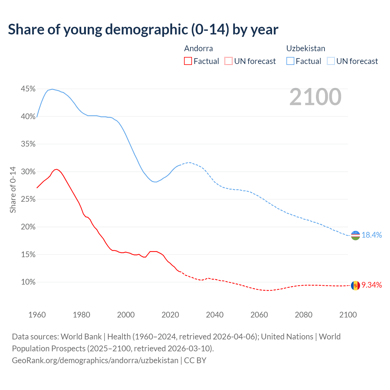 - The share of young demographic (0-15 years old) in Andorra is 11.9% vs 31.1% in Uzbekistan.
