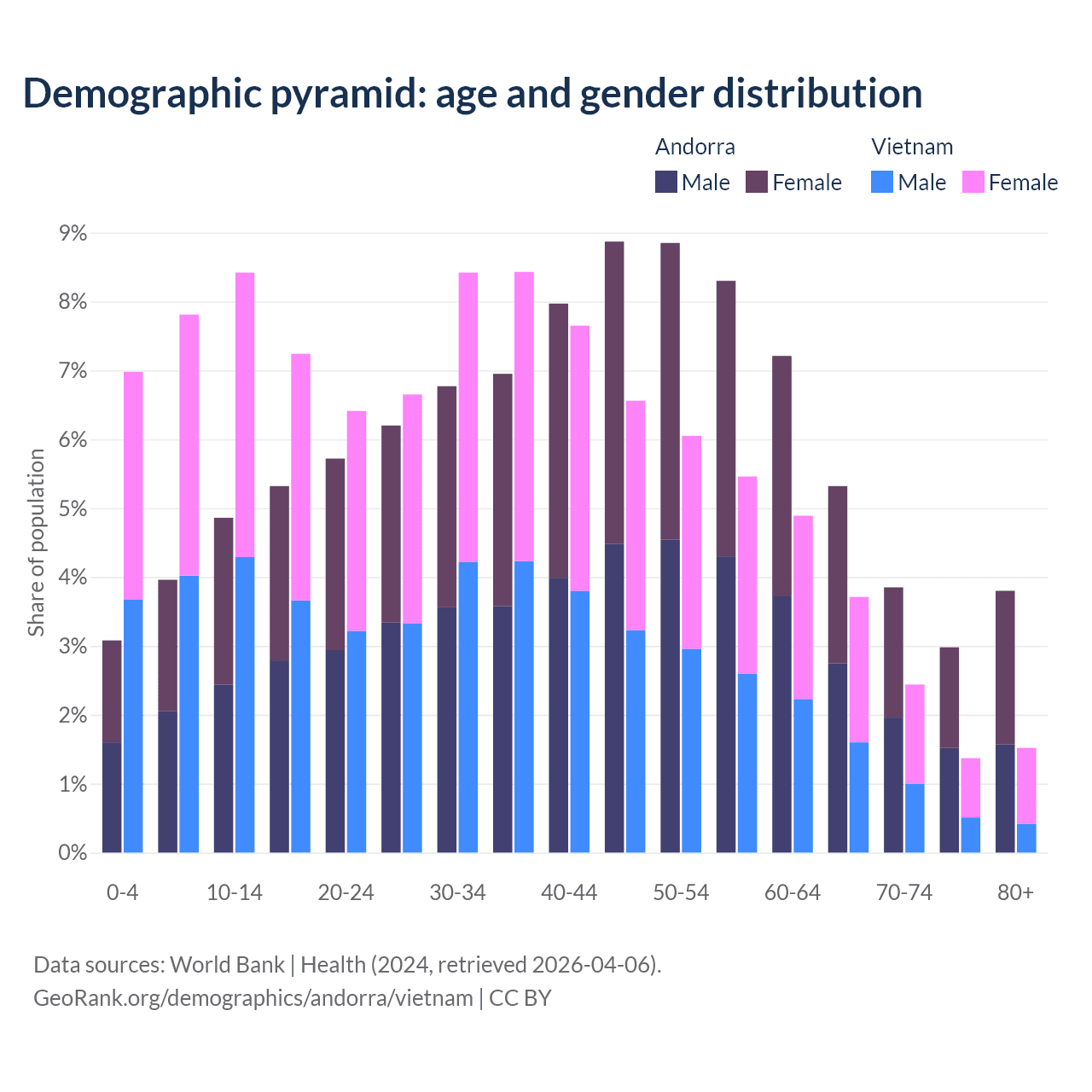 - Andorra is ranked 18/196 by median age (oldest to youngest) vs 84/196 for Vietnam.