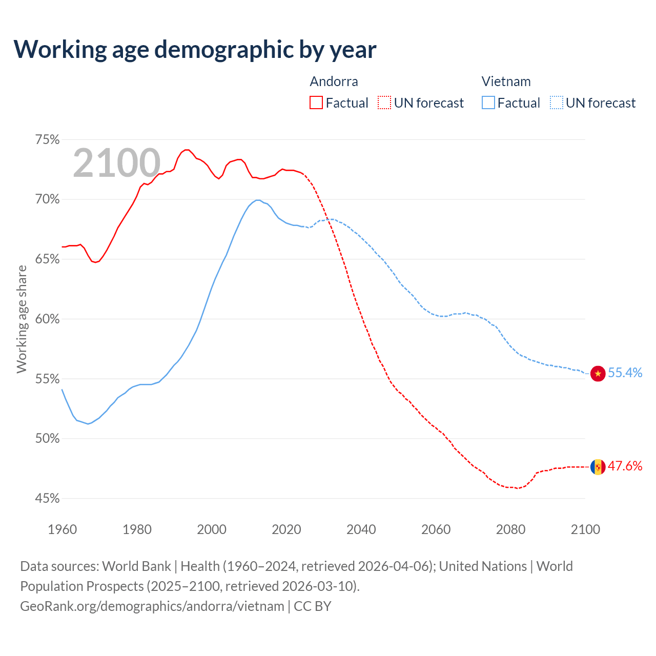 - Andorra has 60.7K working age adults (aged 15-64) vs 69.3M in Vietnam.