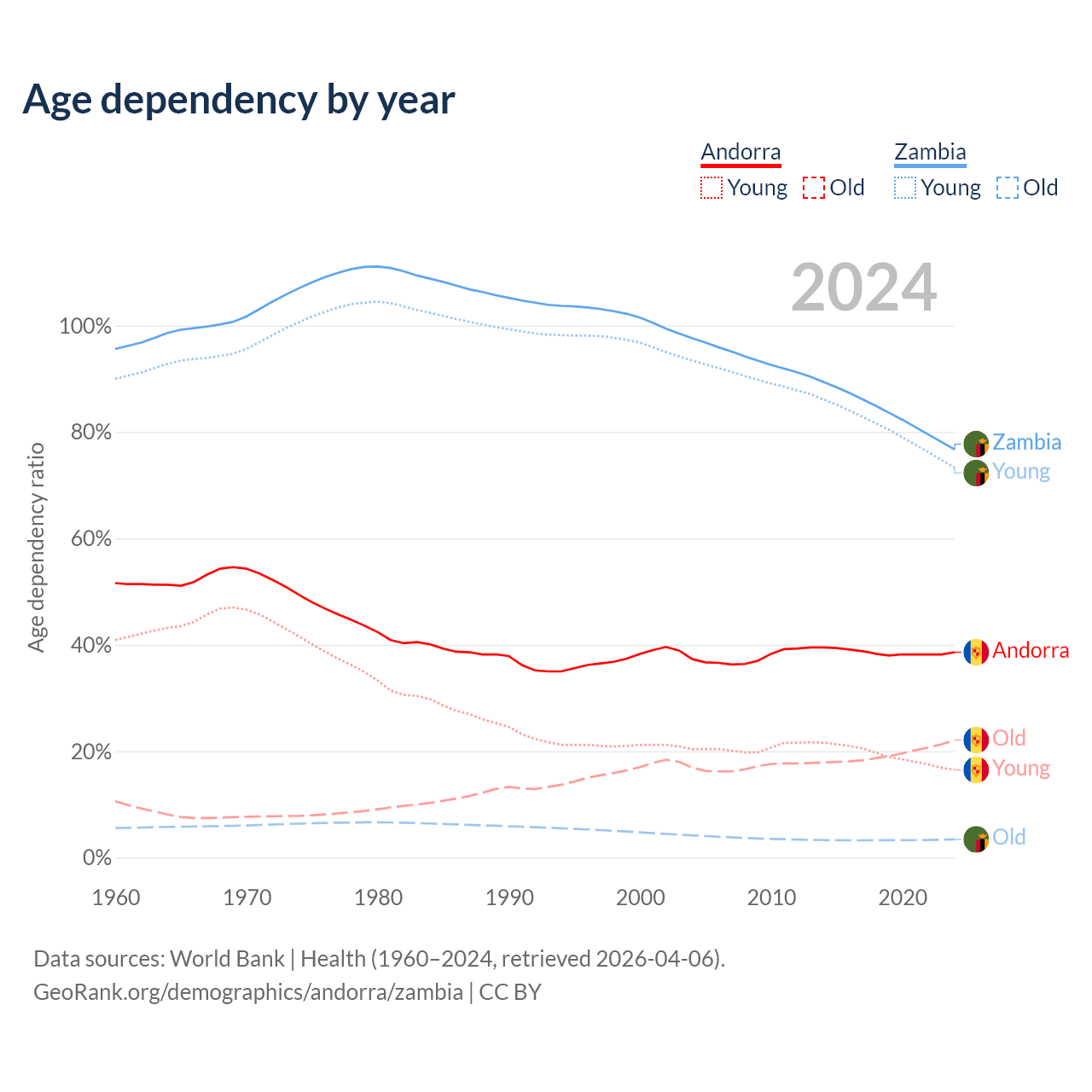 - Andorra is ranked 18/196 by median age (oldest to youngest) vs 182/196 for Zambia.
