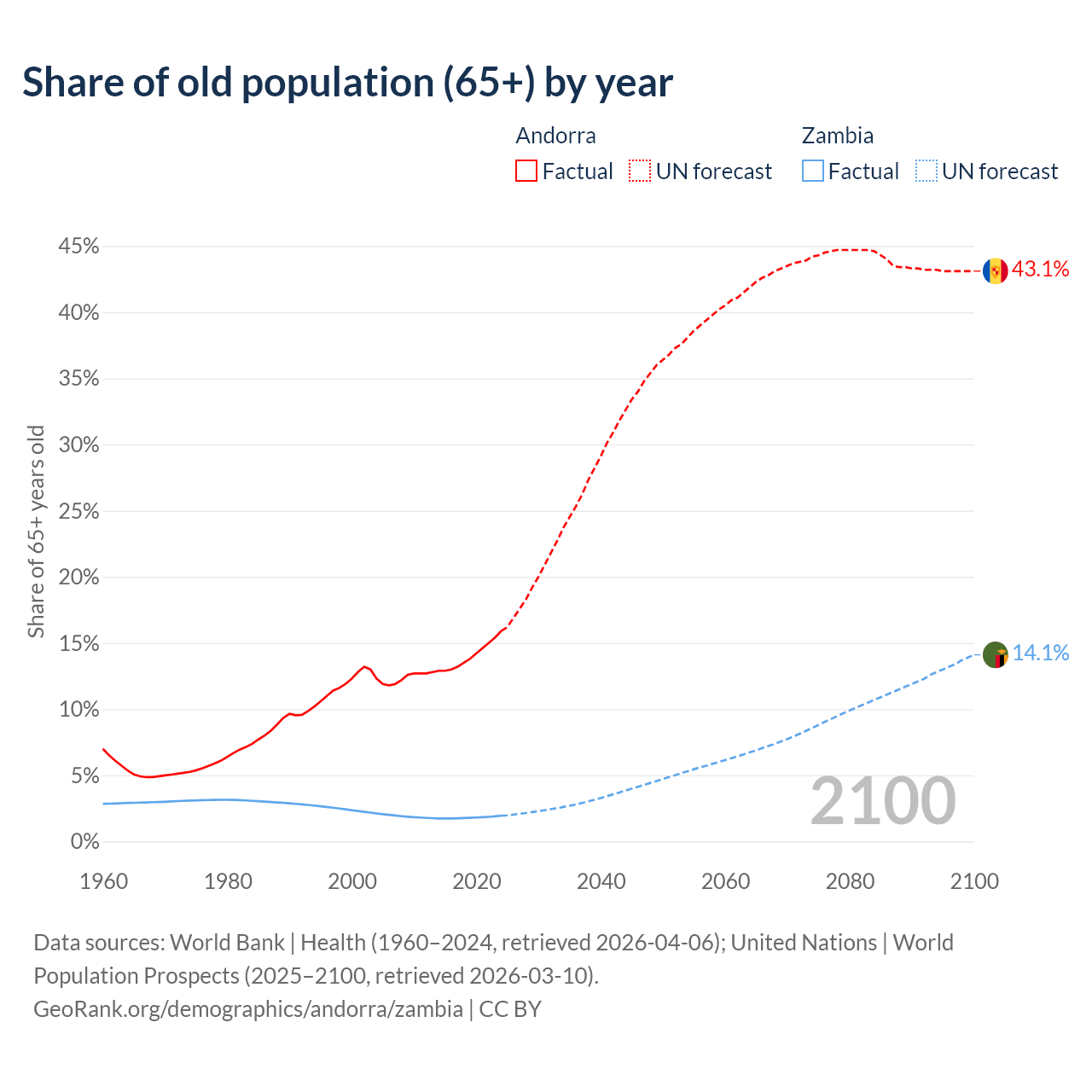The share of older people aged 65 and over is 15.9% in Andorra and 1.95% in Zambia. Life expectancy in Andorra compared to Zambia .