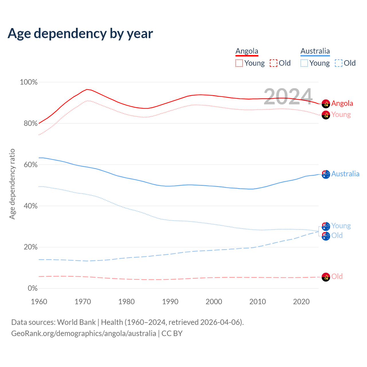 Data sources: World Bank | Health (1960–2024, retrieved 2026-04-06); U.S. Census Bureau (1960–2024, retrieved 2026-02-08).