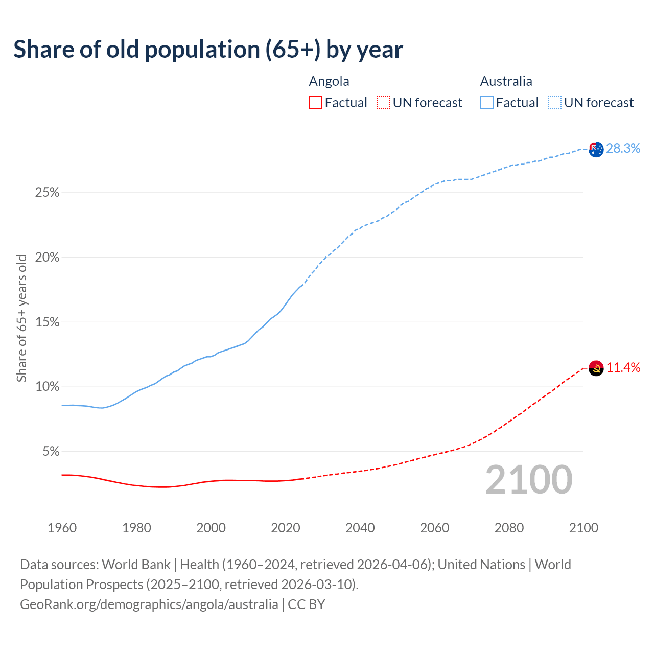 The share of older people aged 65 and over is 2.85% in Angola and 17.7% in Australia. Life expectancy in Angola compared to Australia .