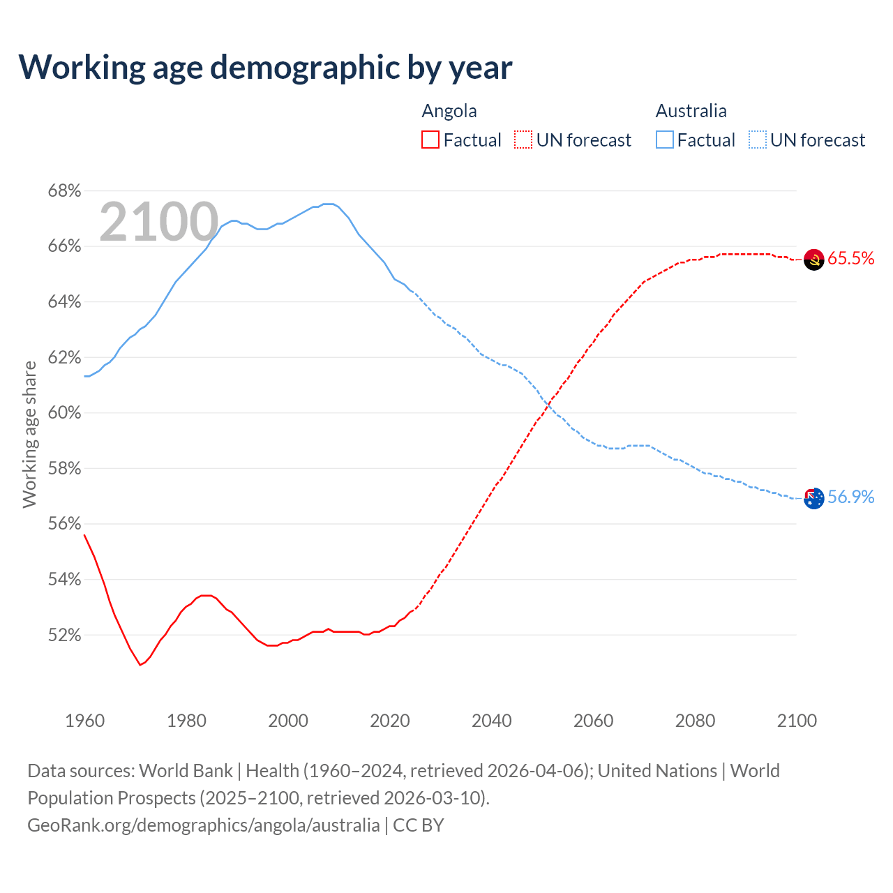 Median age Angola vs Australia, 1960-2100