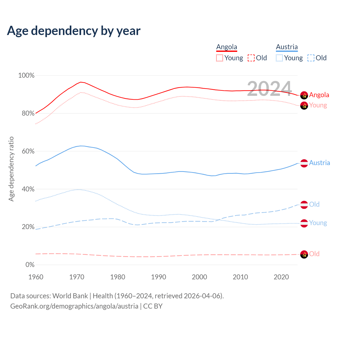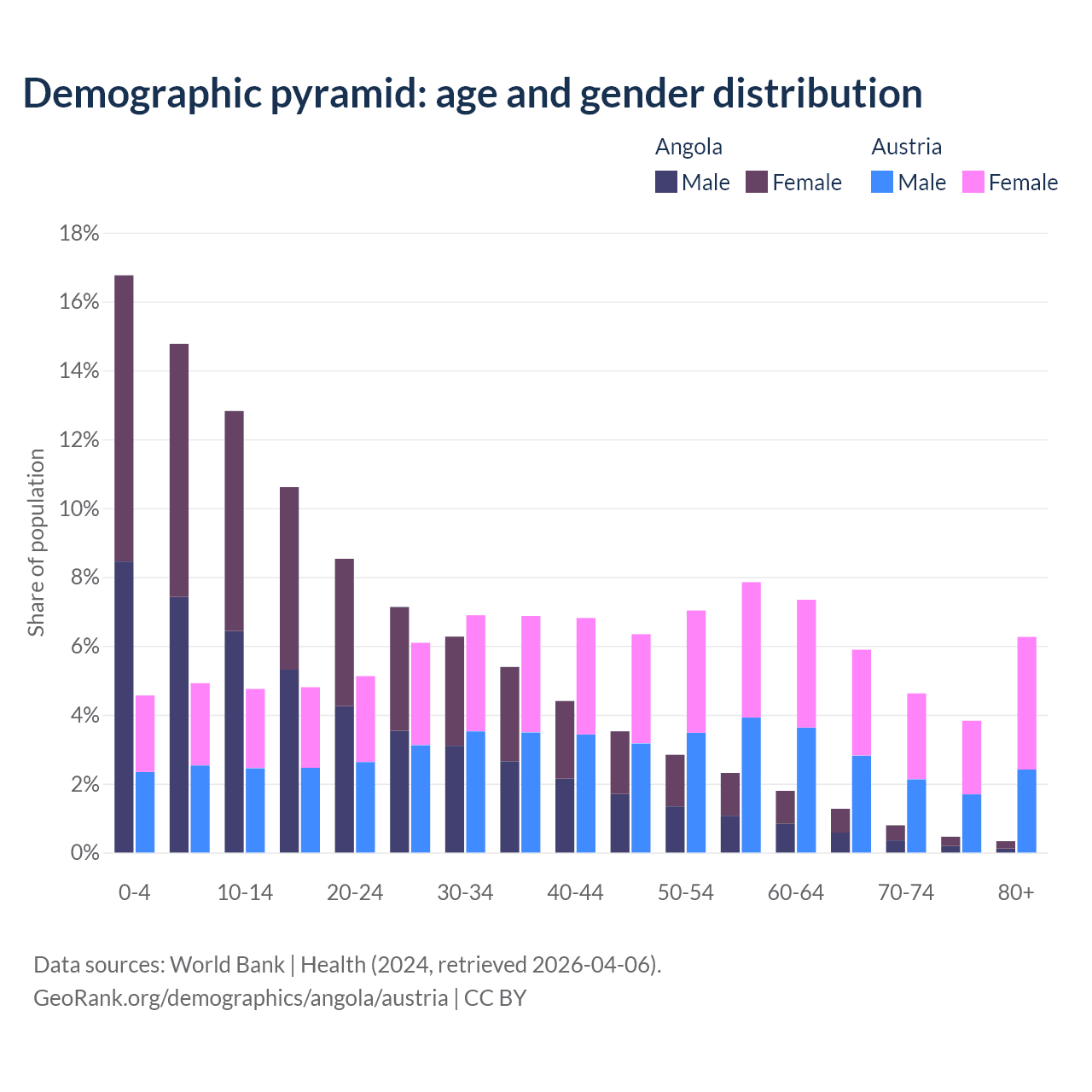 - Angola is ranked 188/196 by median age (oldest to youngest) vs 19/196 for Austria.