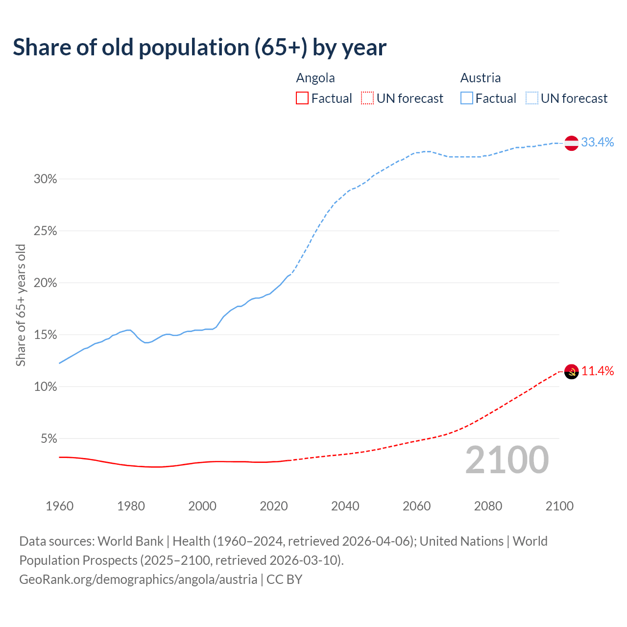 The share of older people aged 65 and over is 2.85% in Angola and 20.6% in Austria. Life expectancy in Angola compared to Austria .