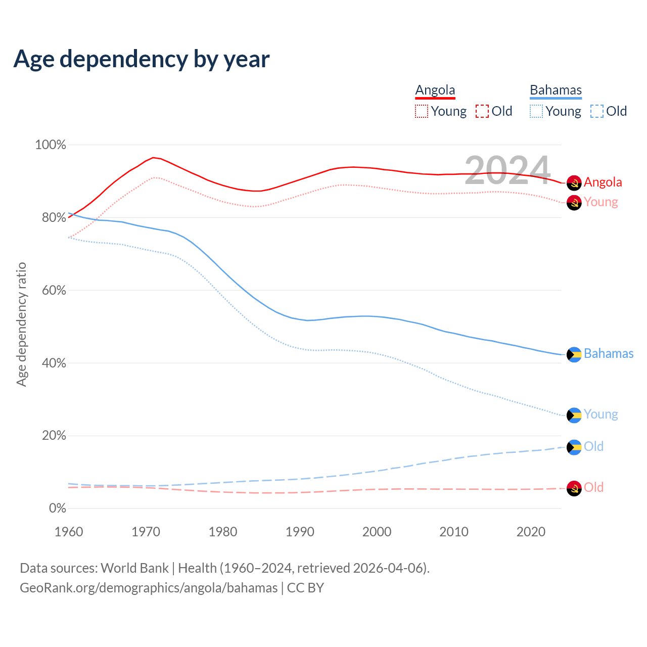 - Angola is ranked 188/196 by median age (oldest to youngest) vs 70/196 for the Bahamas.