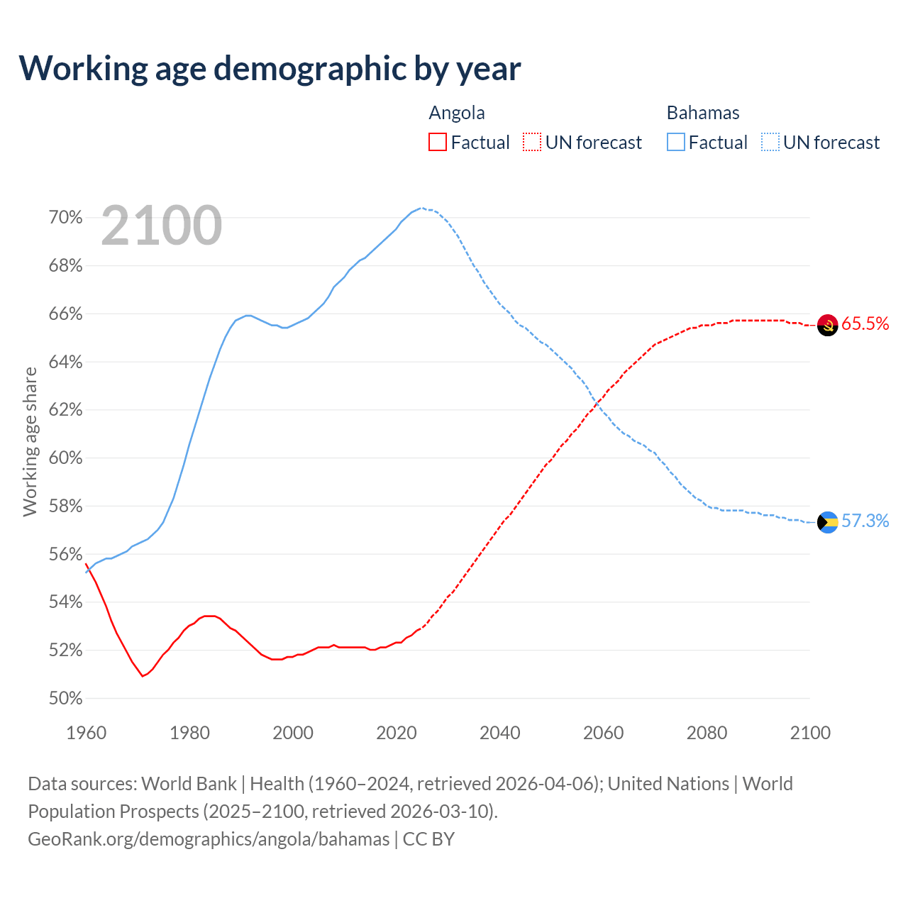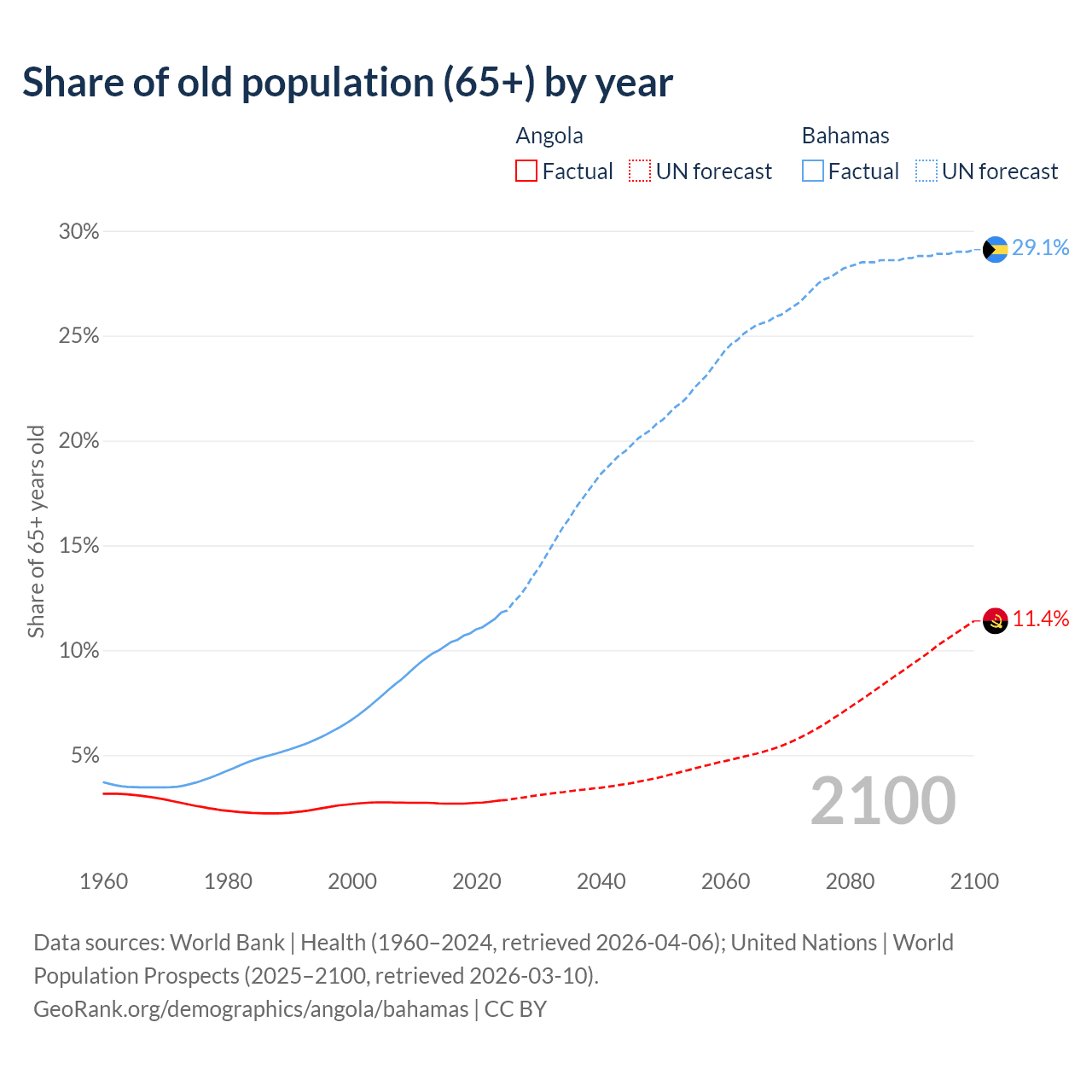 The share of older people aged 65 and over is 2.85% in Angola and 11.8% in the Bahamas. Life expectancy in Angola compared to the Bahamas .