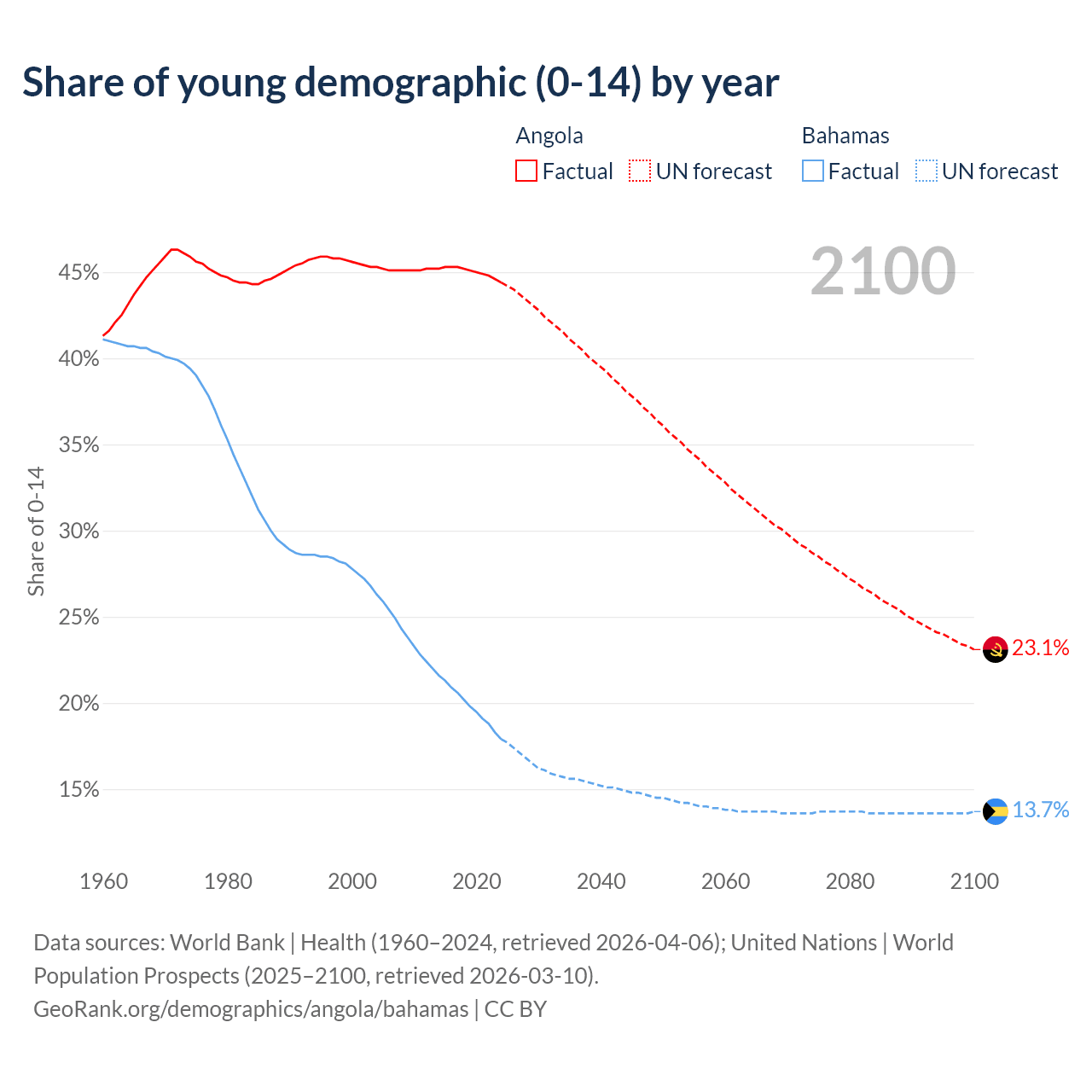 - The share of young demographic (0-15 years old) in Angola is 44.4% vs 17.9% in the Bahamas.