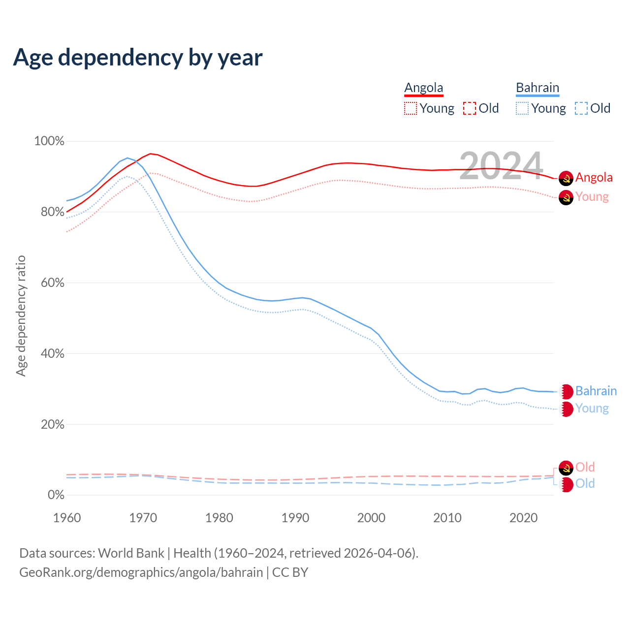 - Angola is ranked 188/196 by median age (oldest to youngest) vs 80/196 for Bahrain.