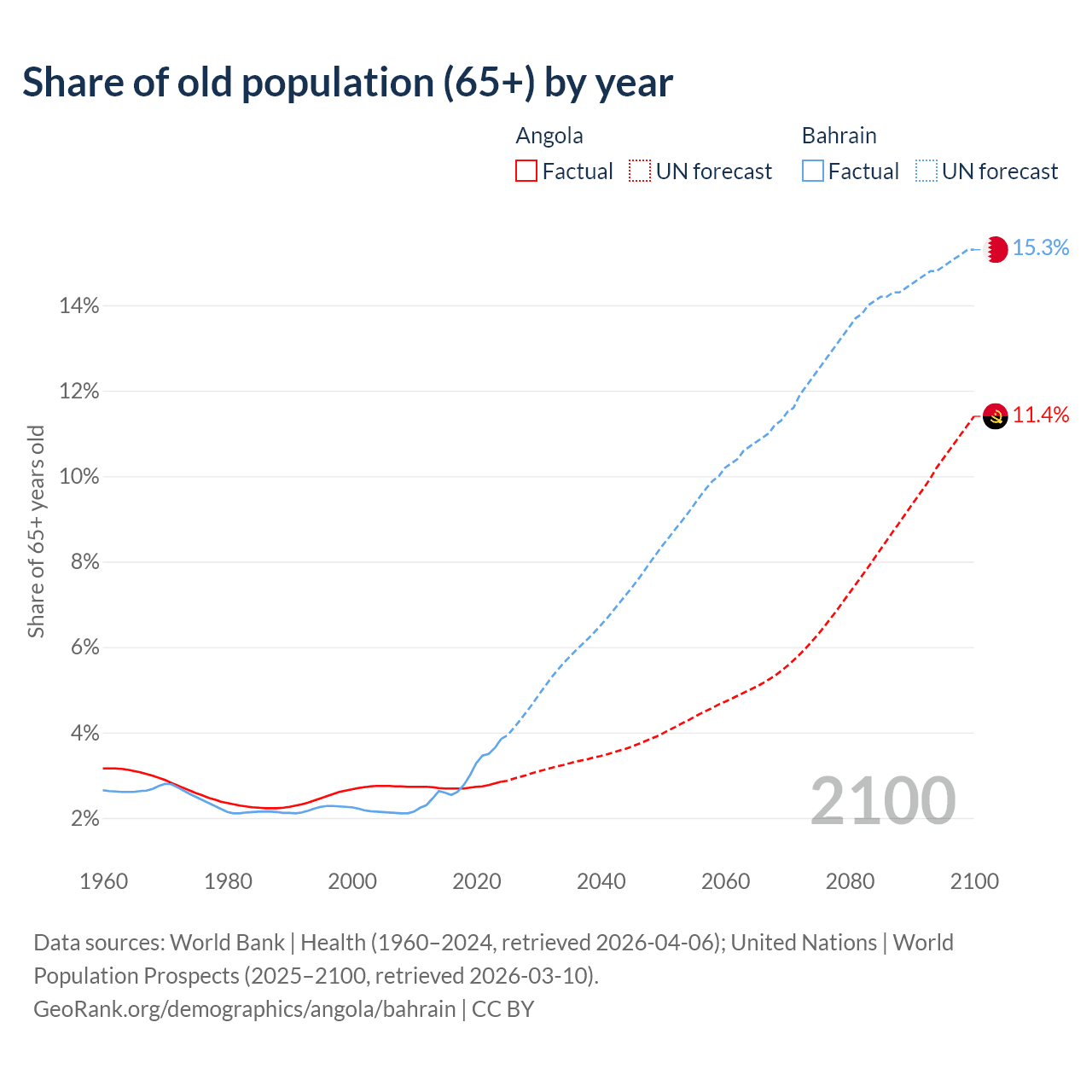 The share of older people aged 65 and over is 2.85% in Angola and 3.85% in Bahrain. Life expectancy in Angola compared to Bahrain .