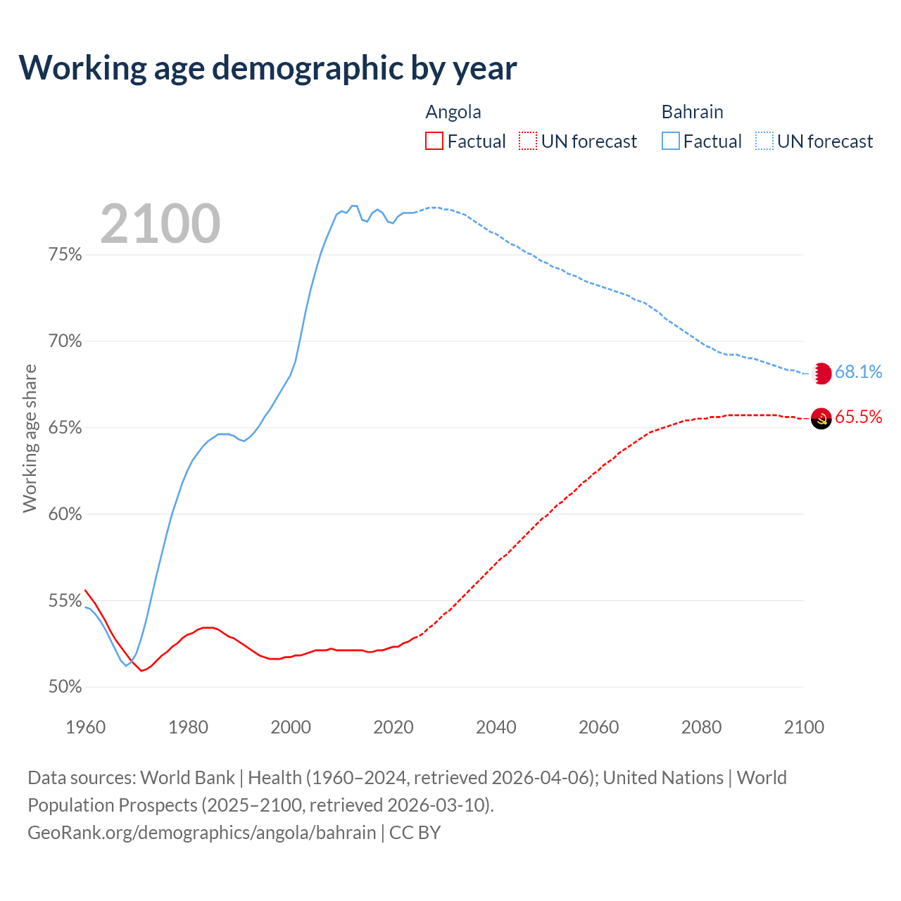 - Angola has 21.4M working age adults (aged 15-64) vs 1.29M in Bahrain.