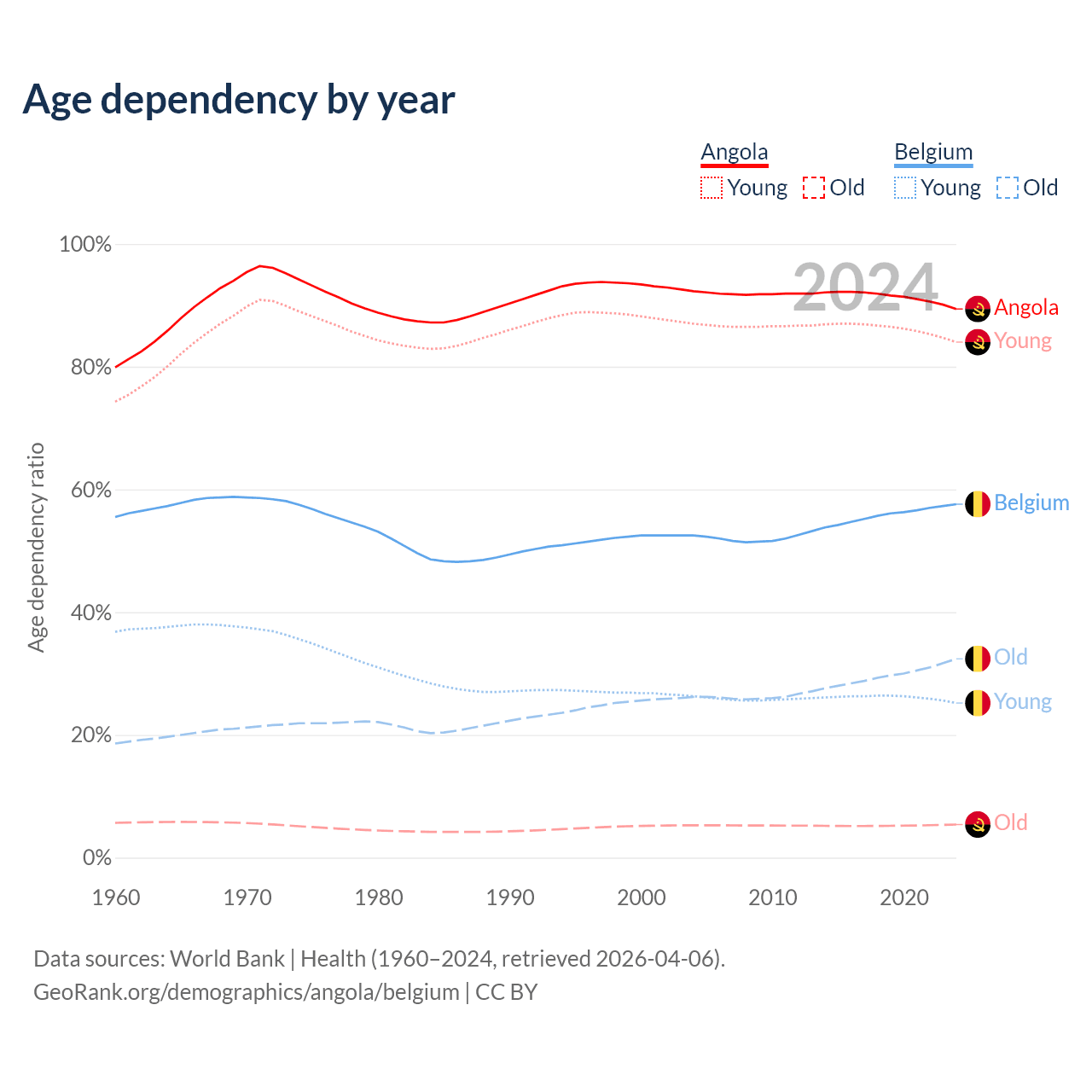- Angola is ranked 188/196 by median age (oldest to youngest) vs 32/196 for Belgium.